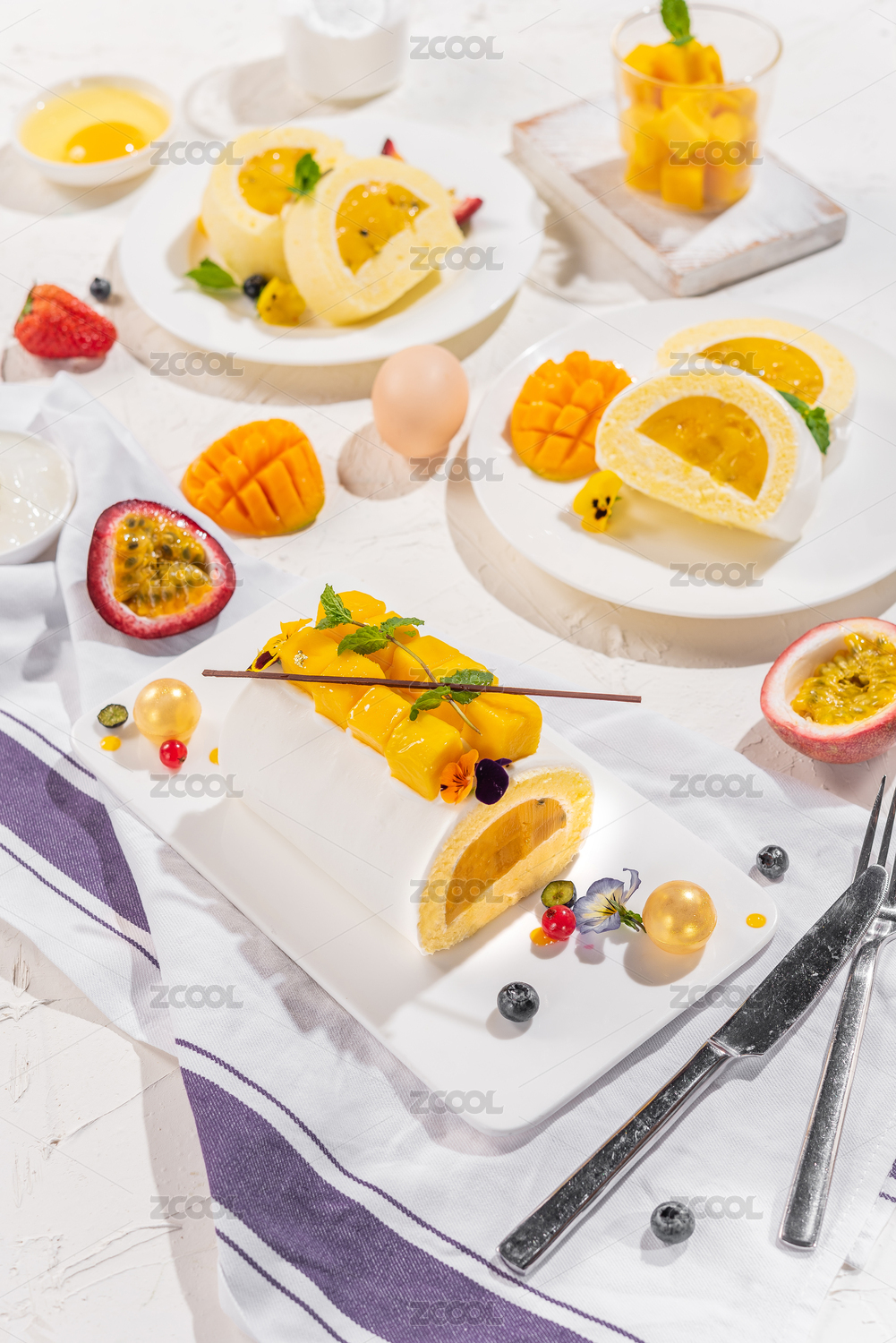 古早蛋糕卷,卷夹心法国芒果果茸,海南椰果,新鲜百香果,芒果果肉,芒果瑞士卷,甜点,法国,美食