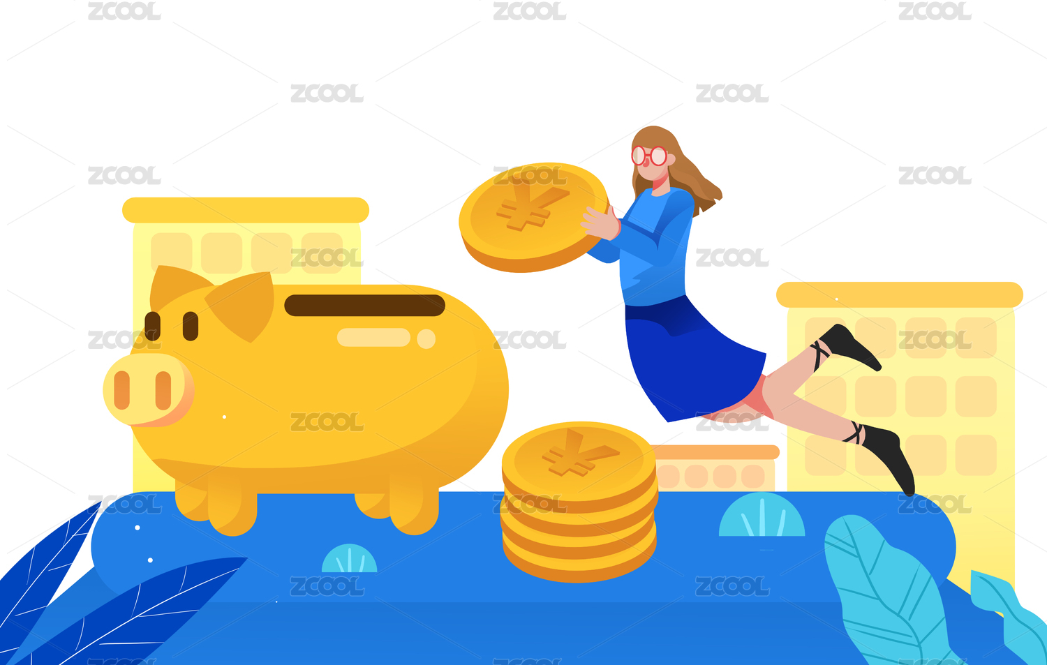 互联网金融理财插画商务人物储蓄罐存钱海报