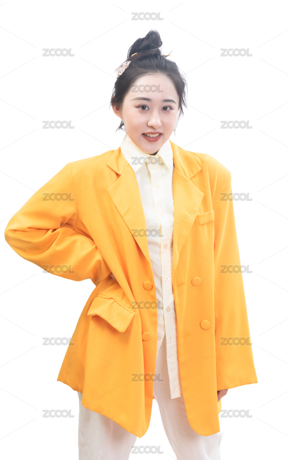 拿着金色玫瑰花的橙色西装半身女性肖像