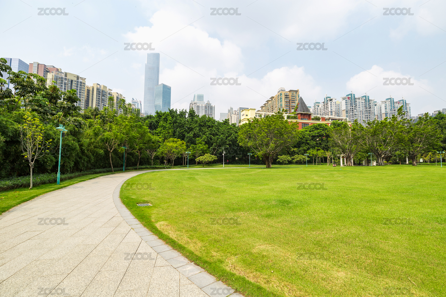 中国深圳市金融区天际线和公园草地风景