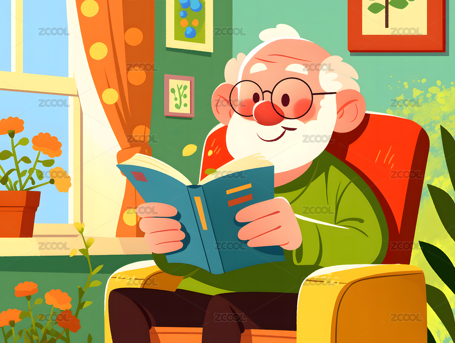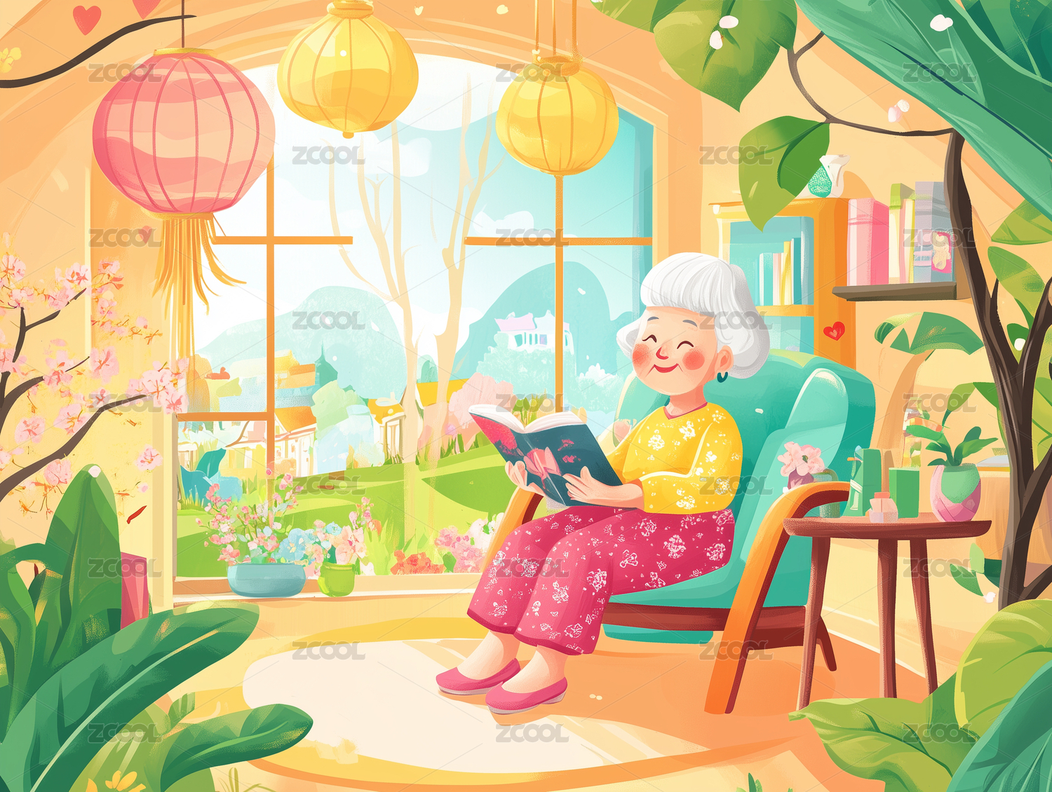 老奶奶坐在沙发上看书落地窗盆栽书柜插画