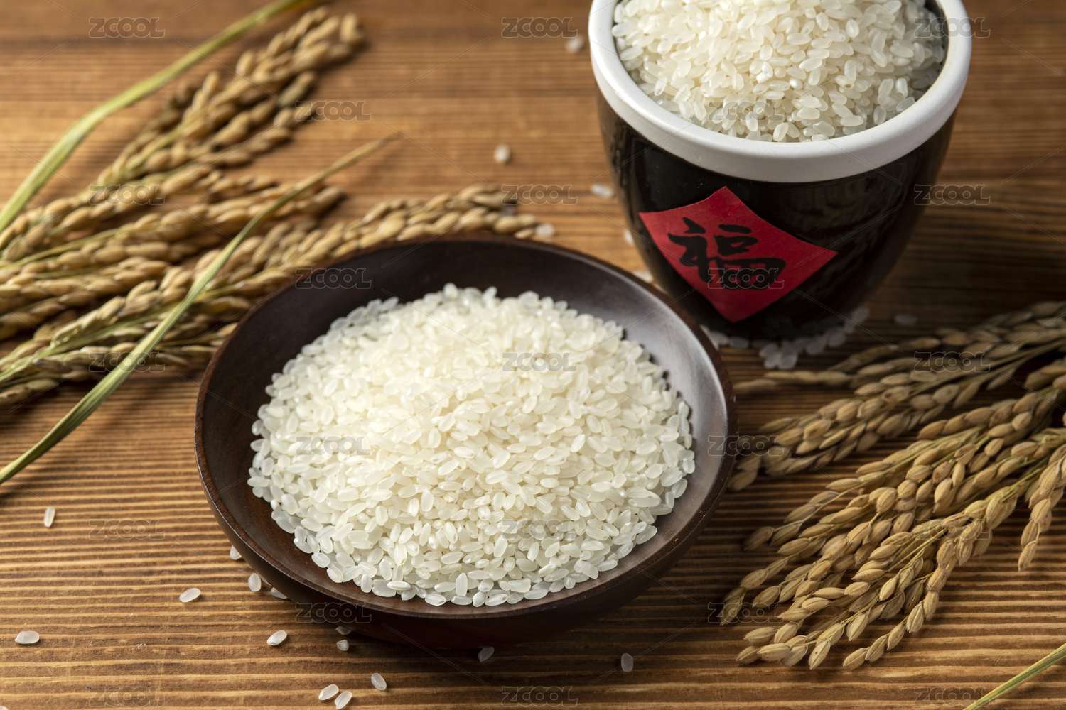 大米与稻穗摆放在木桌面上特写