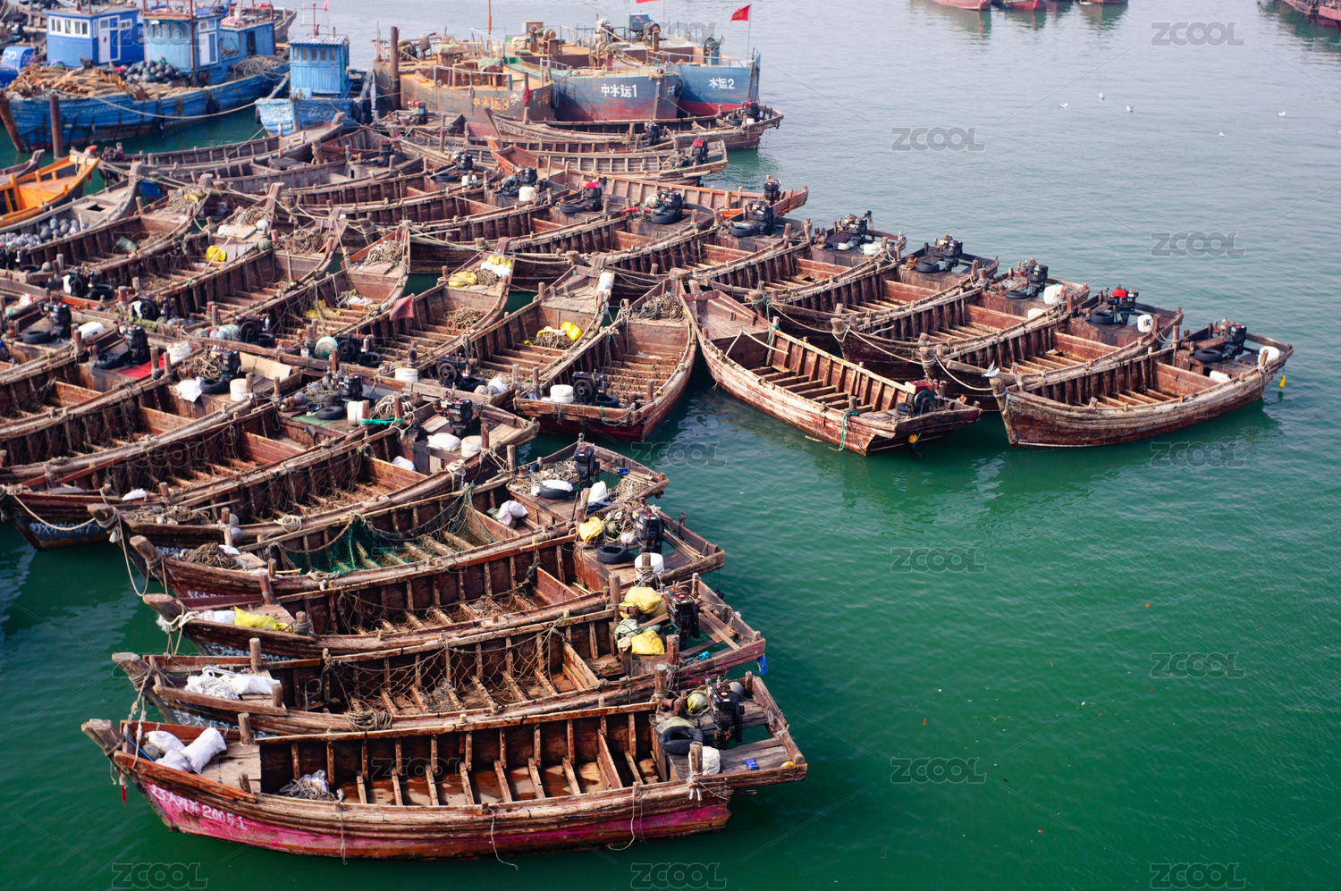 俯拍大连金石滩渔港海面停泊的一排排渔船