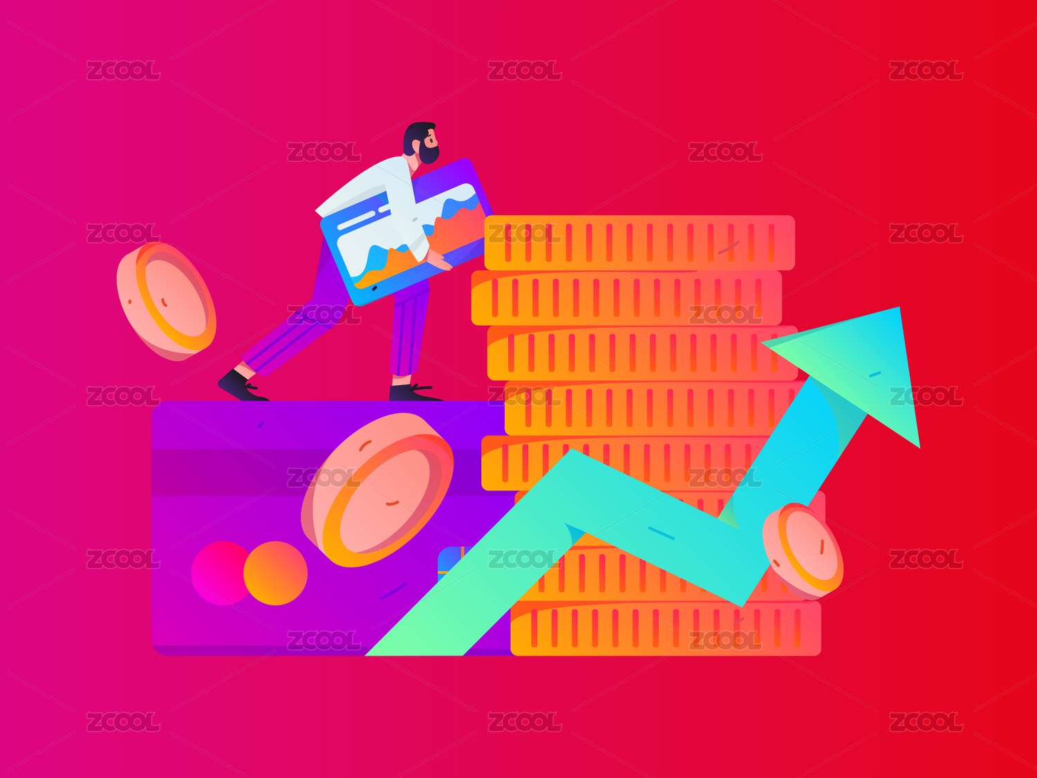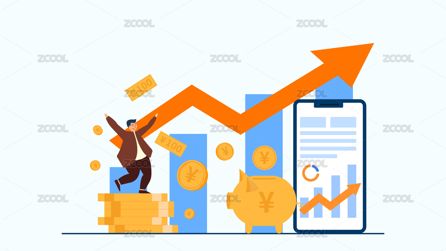卡通手绘男人手持金币财富赚钱网络经济上涨插画