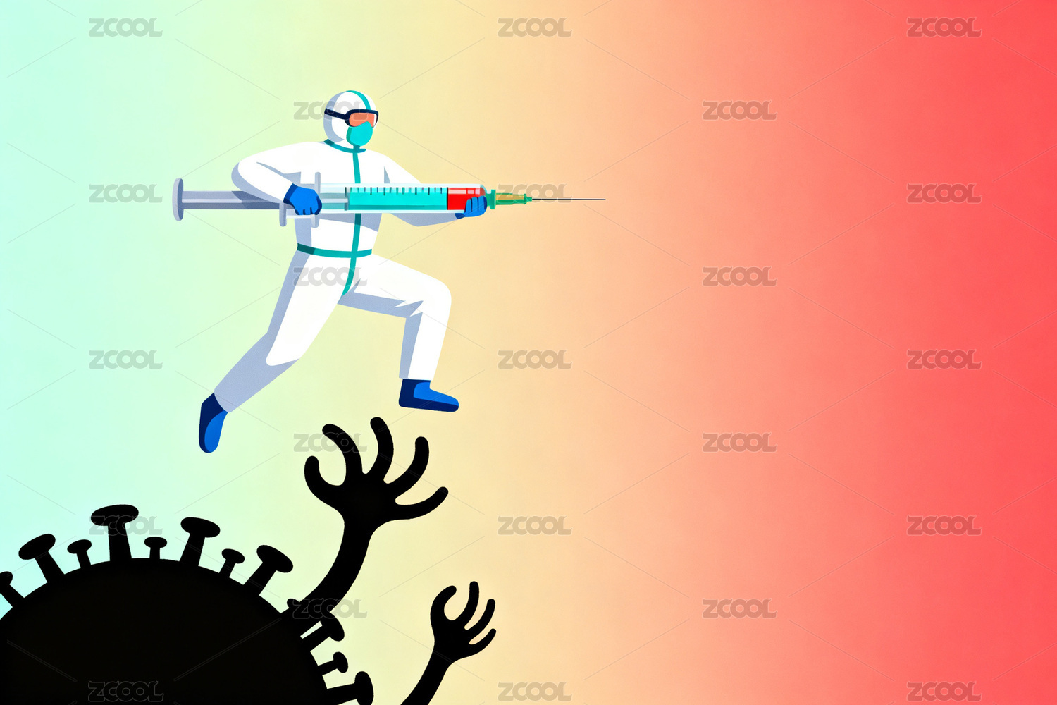 扁平风格医生全副武装消灭病毒插画