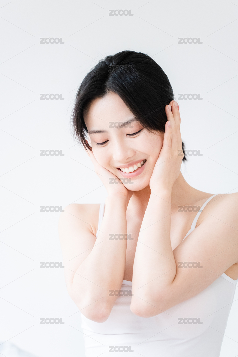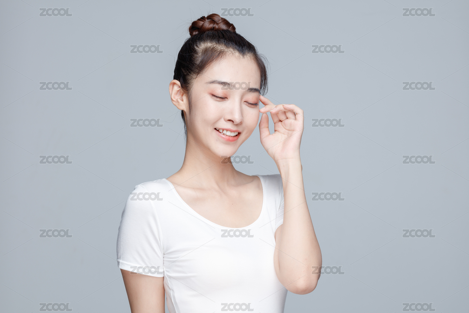 一位美丽的亚裔女孩站在纯色背景墙前用手背轻抚脸颊