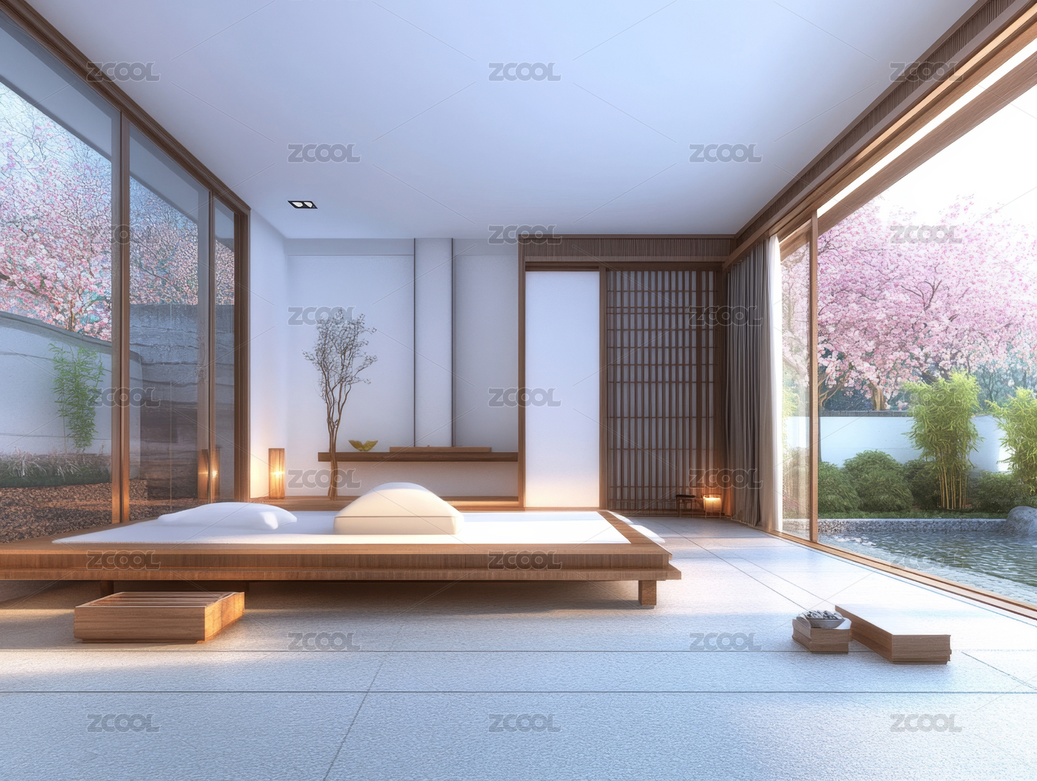 禅意,中式装修,白色卧室,原木风卧室,现代风格,室内环境白色沙发,沙发,灰色,抱枕,圆形物体