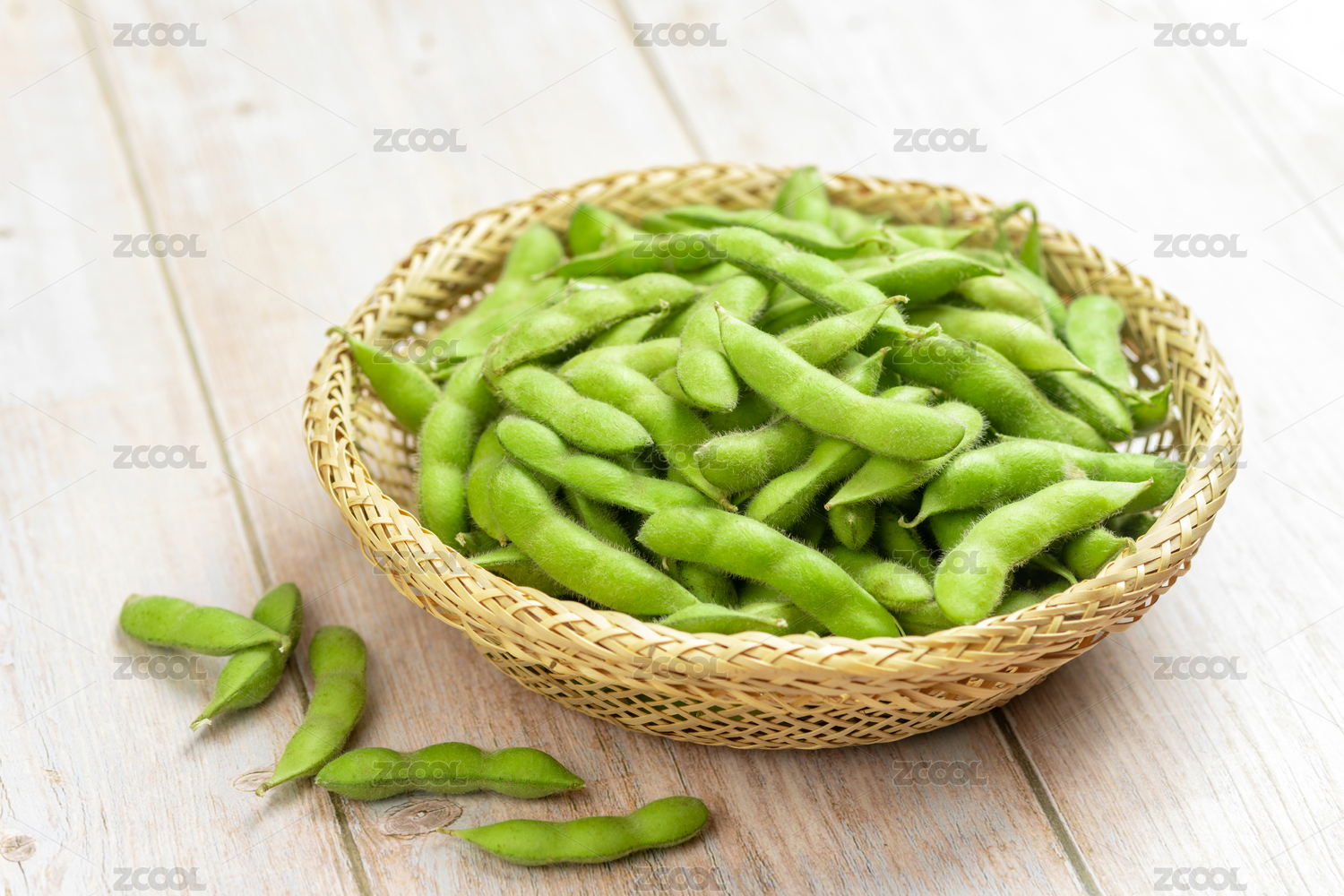 一簸箕毛豆角摆放在木桌面上特写深色调