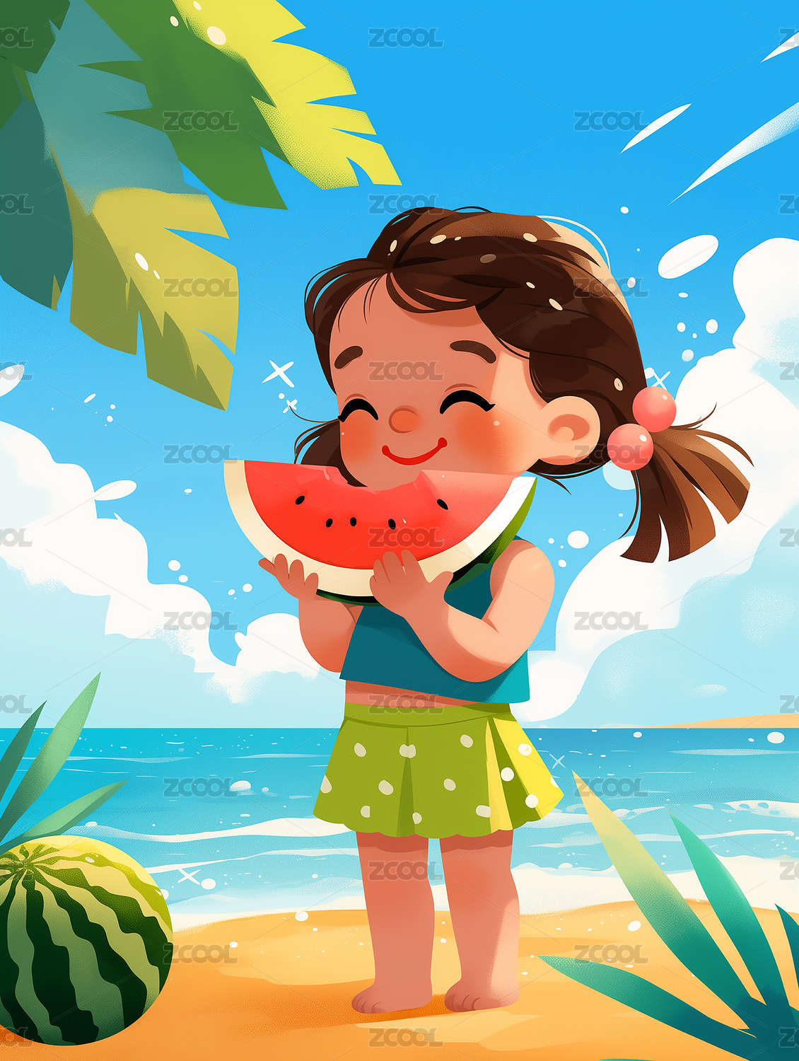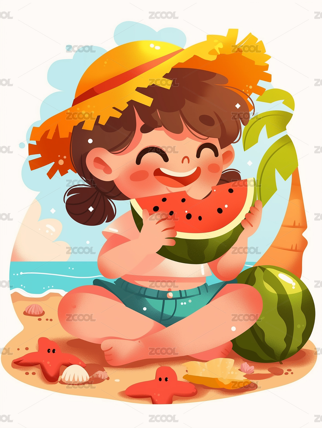 乘凉,吃西瓜,处暑,大暑,儿童,风景,节气,节日,解暑,卡通