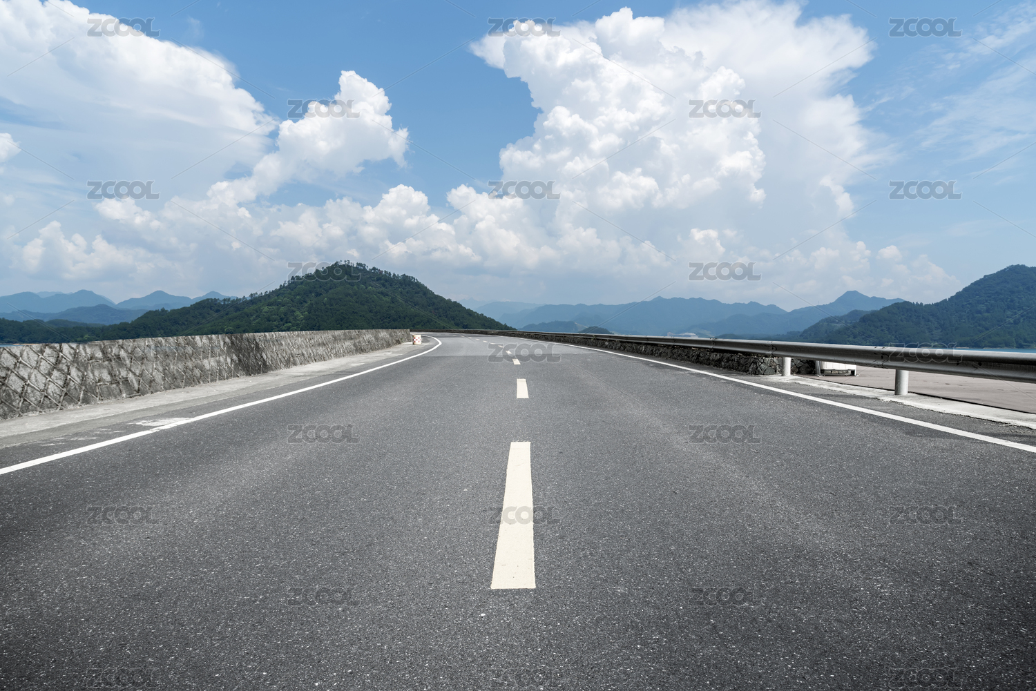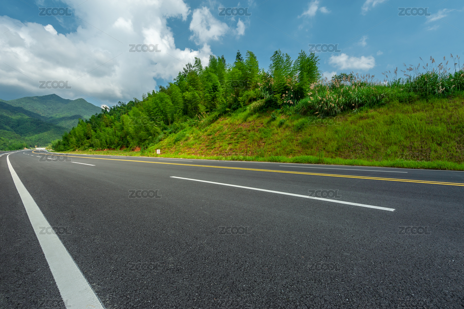 晴好天气下古田近郊一条铺着柏油路面的通往群山之间的快速通道,中国福建上杭古田