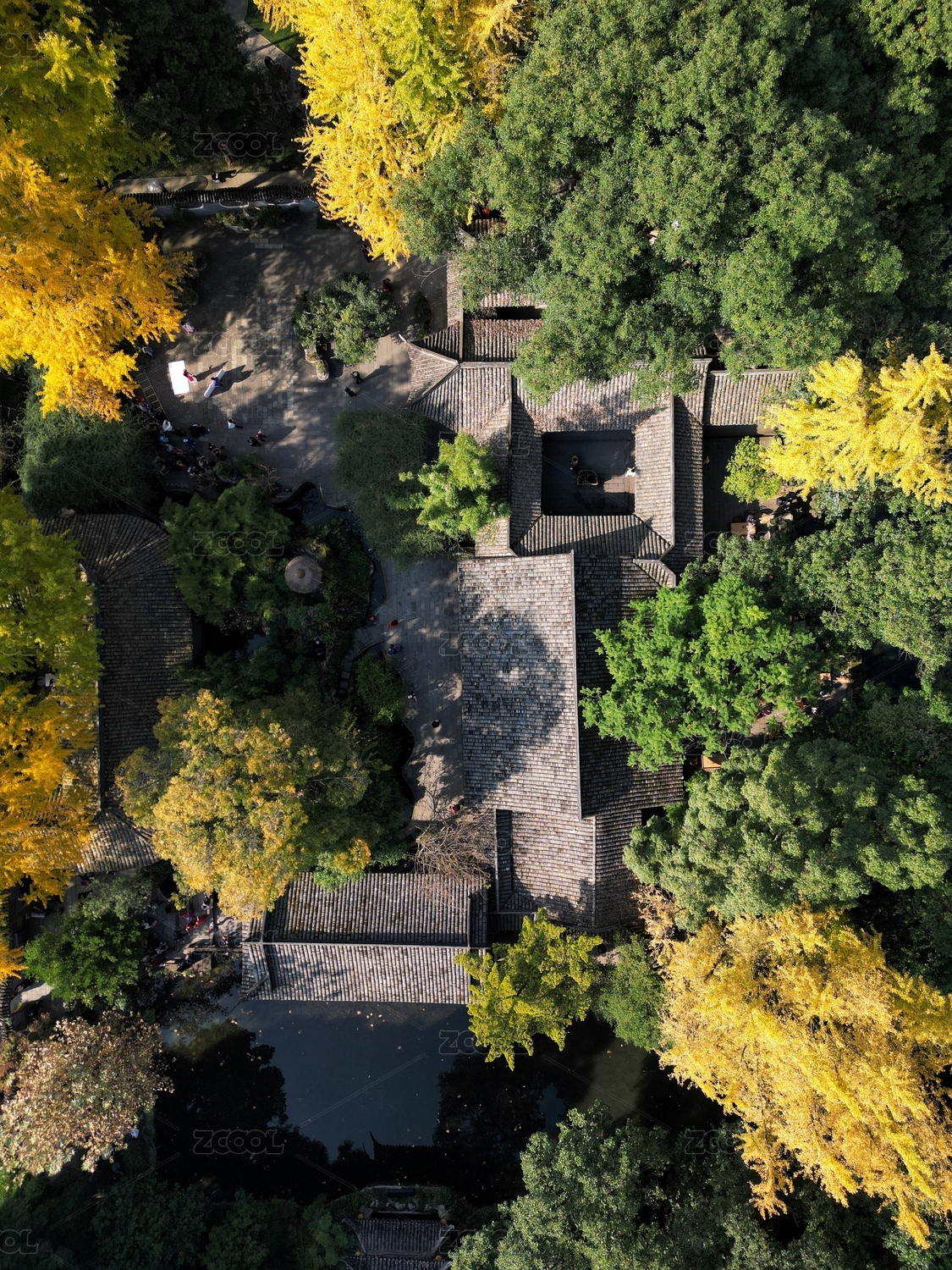 航拍秦岭终南山古观音禅寺冬天雪景里的银杏