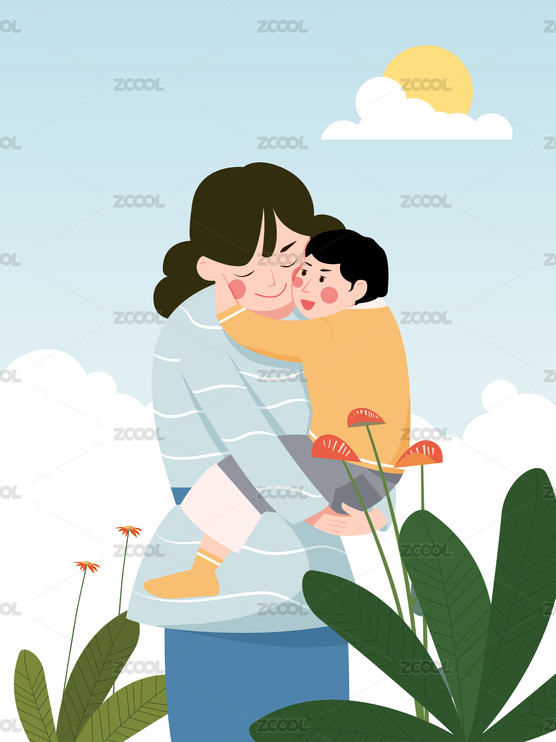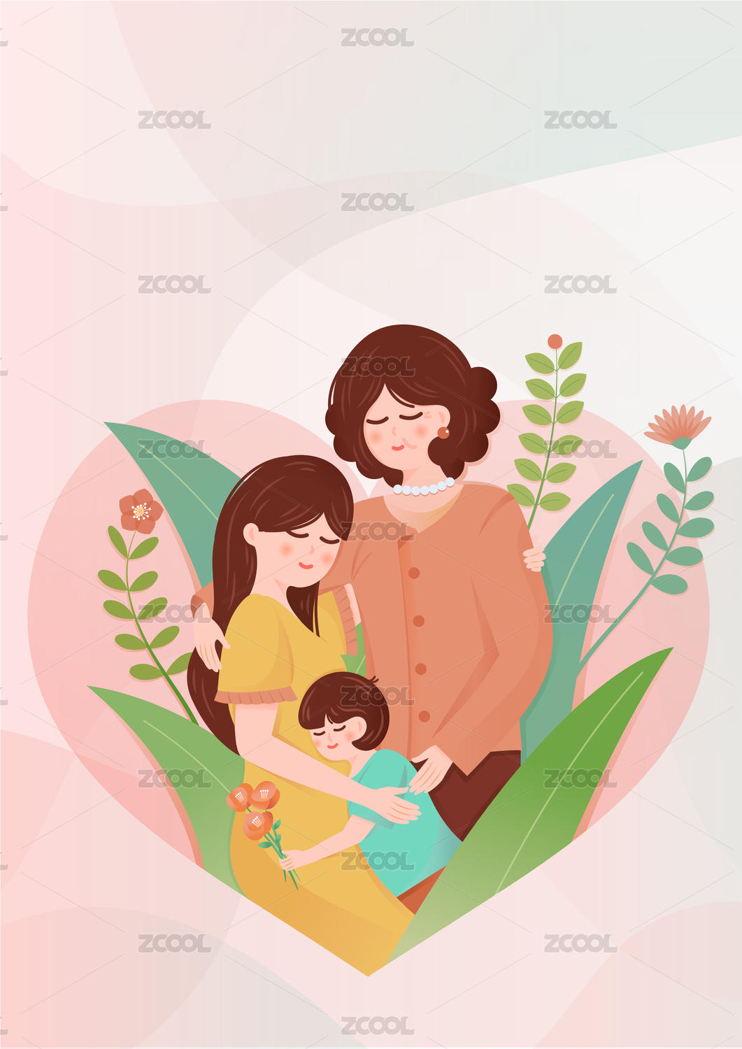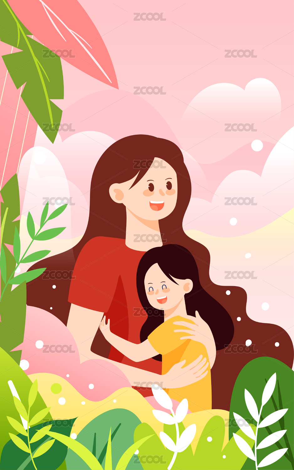 母亲节母女拥抱插画感恩节家人庆祝活动海报