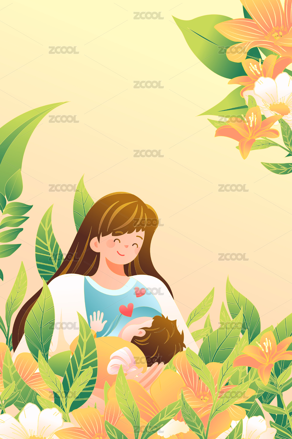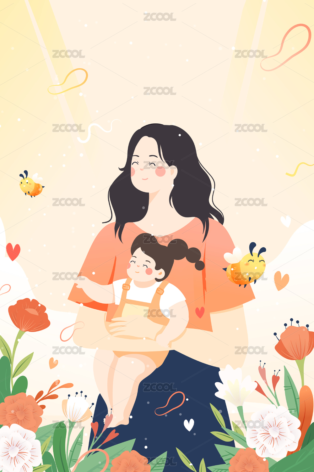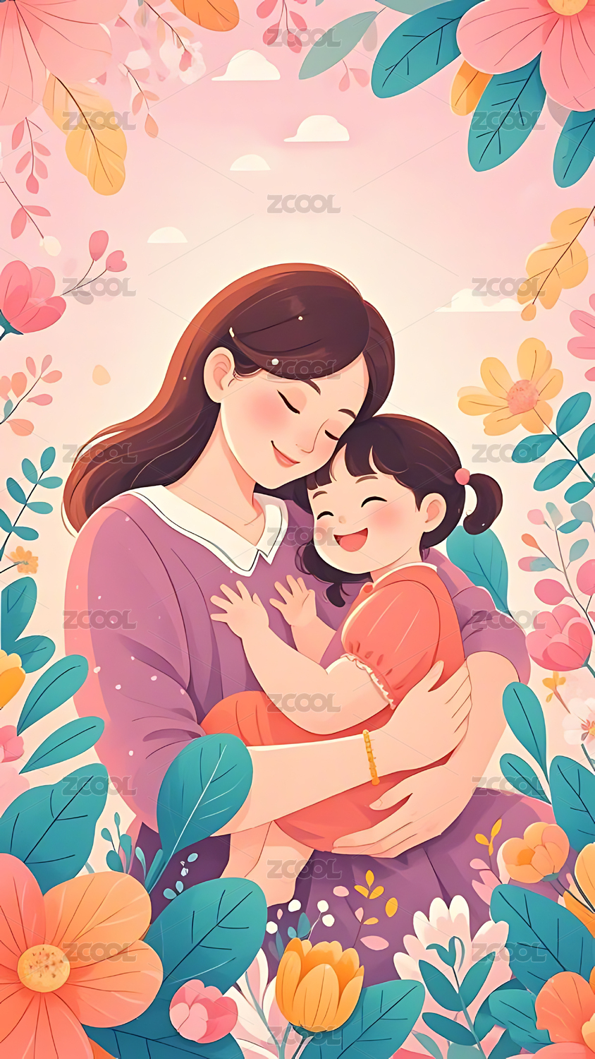 母亲节母女拥抱插画感恩节家人庆祝活动海报