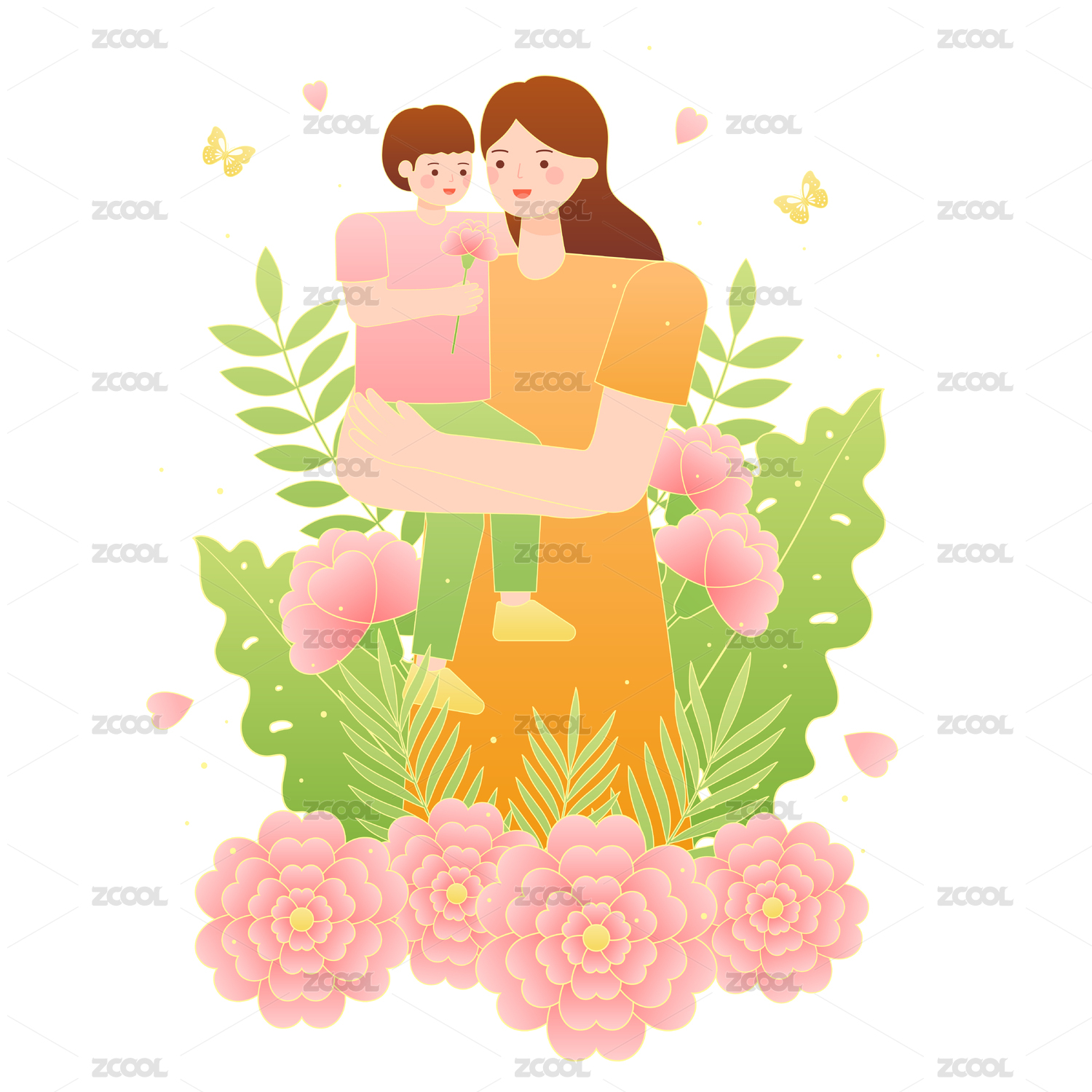母亲节花丛中母亲拥抱孩子的温馨矢量插画