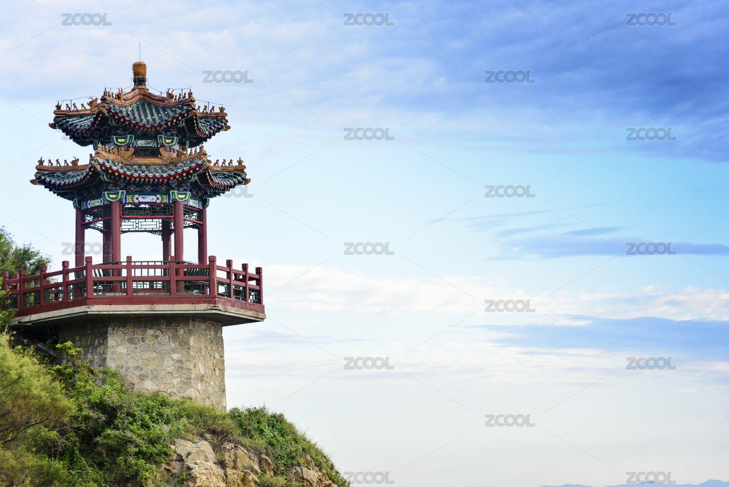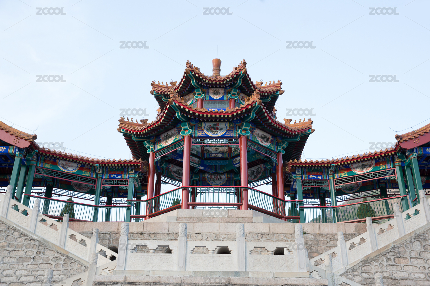 大连金石滩蓝天下的古建筑祈福亭大钟