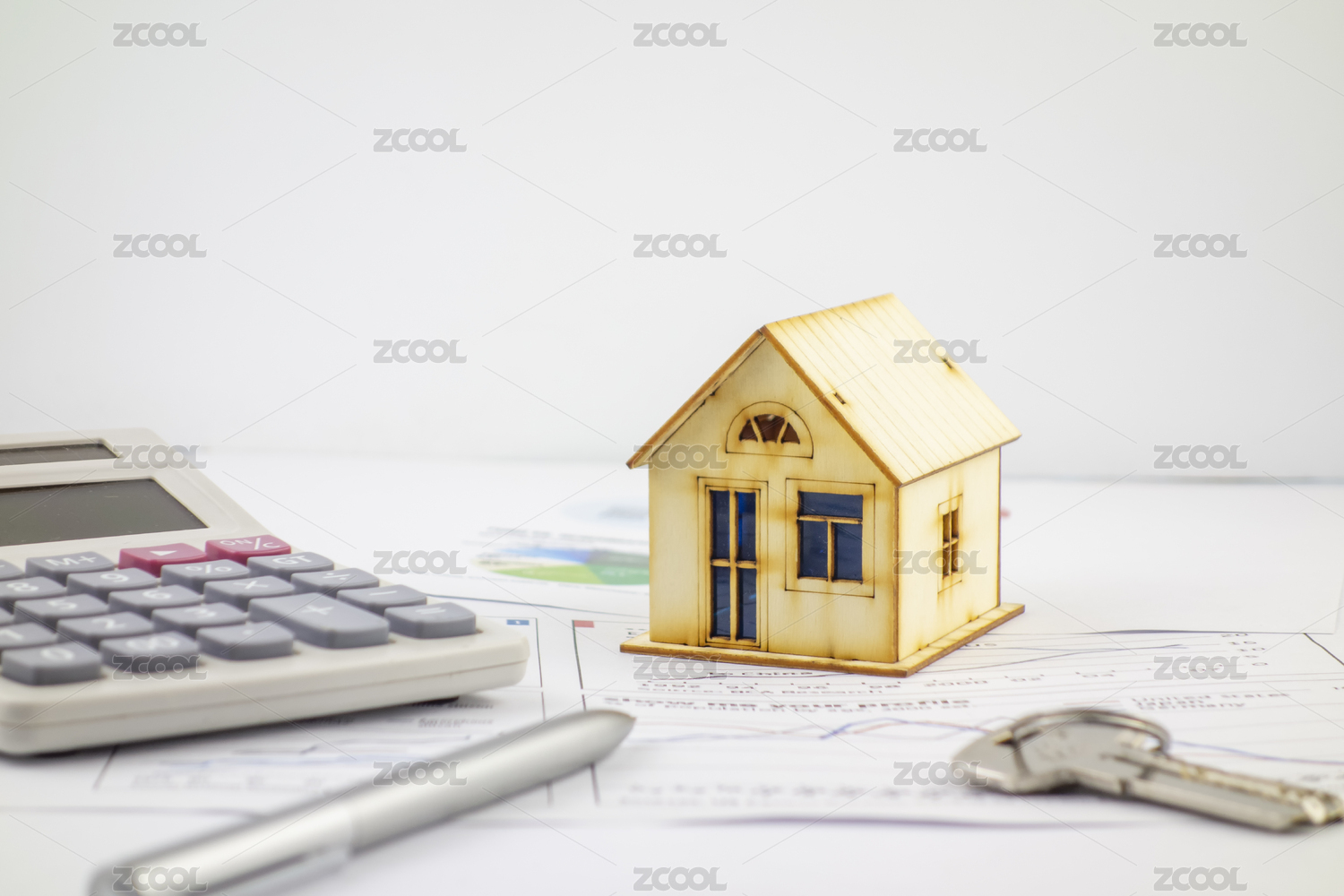 住房装修图纸上的小房子模型和计算器及一个铅笔