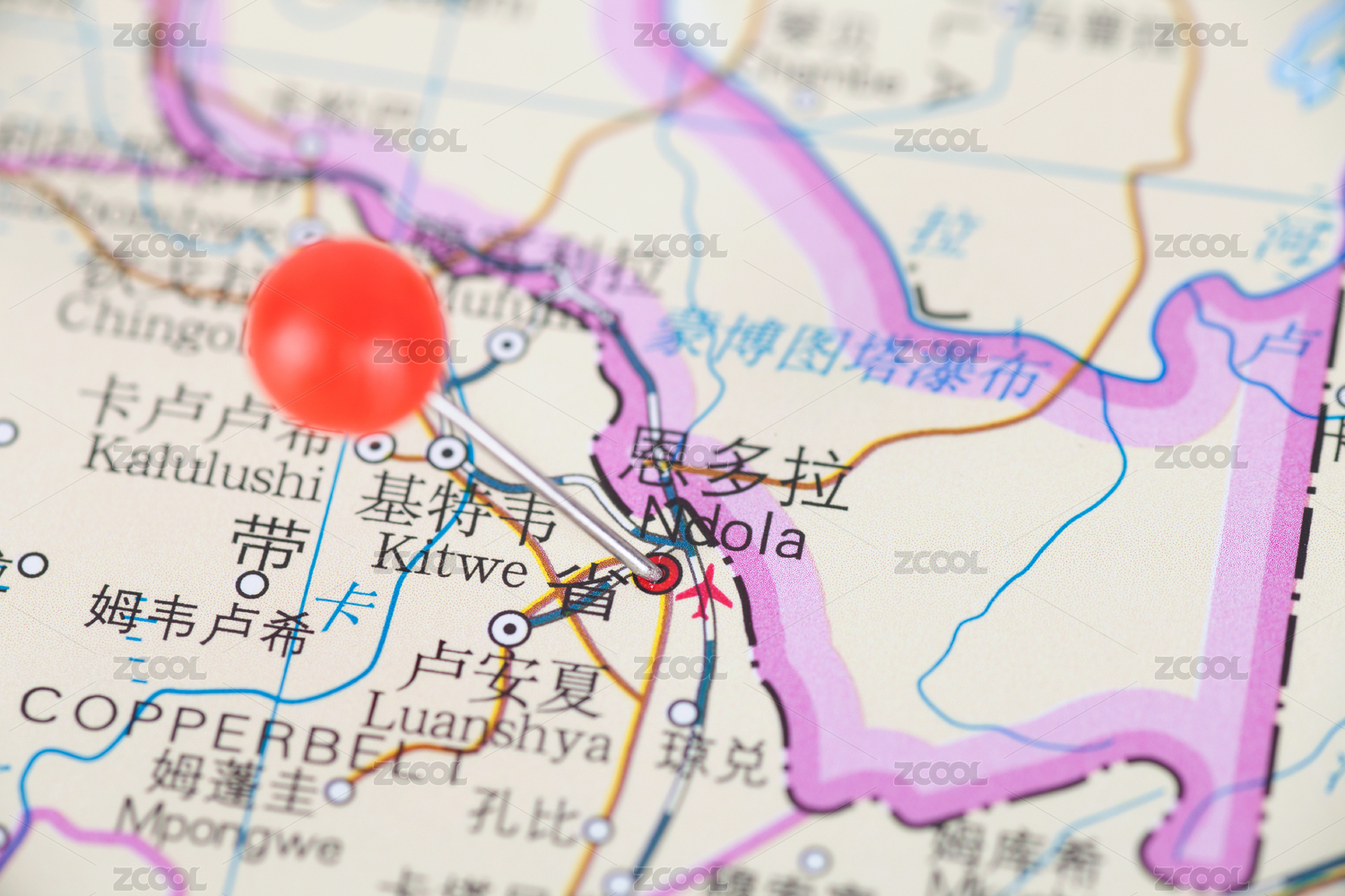 赞比亚城市恩多拉在地图上的位置标注