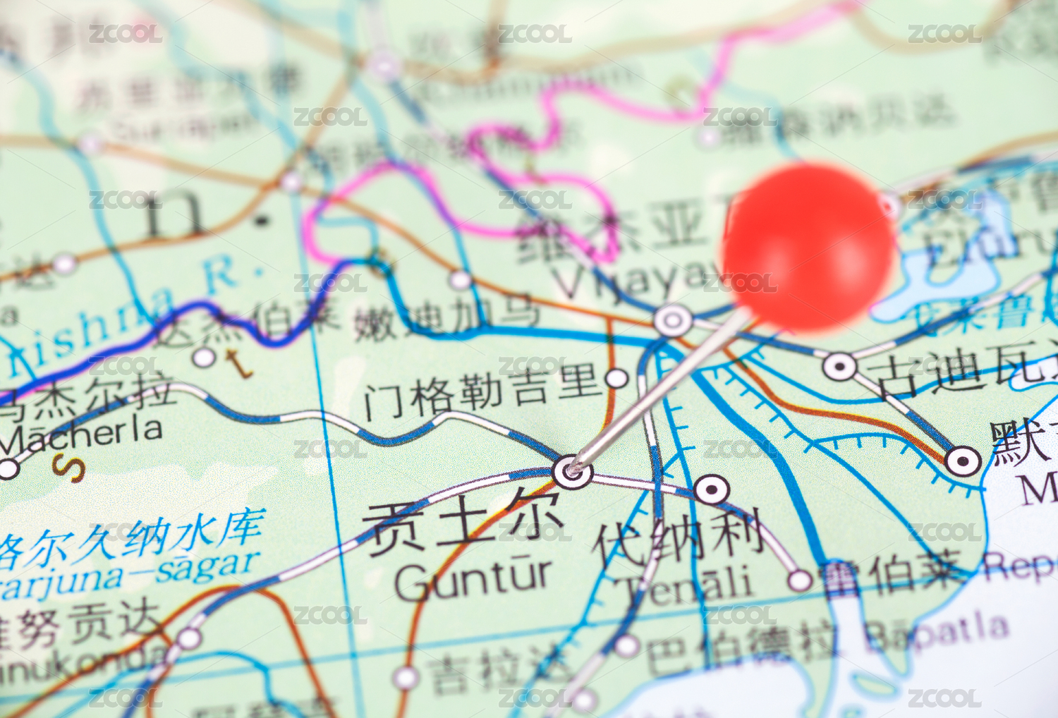 地图上被大头钉标注的印度城市贡土尔