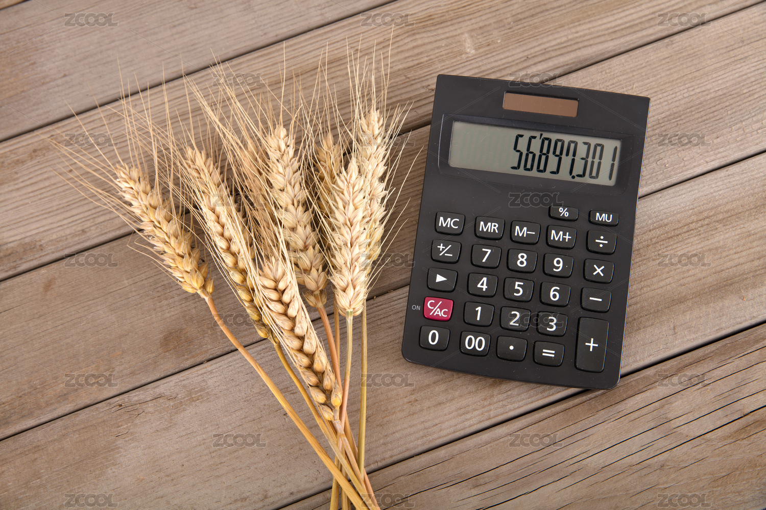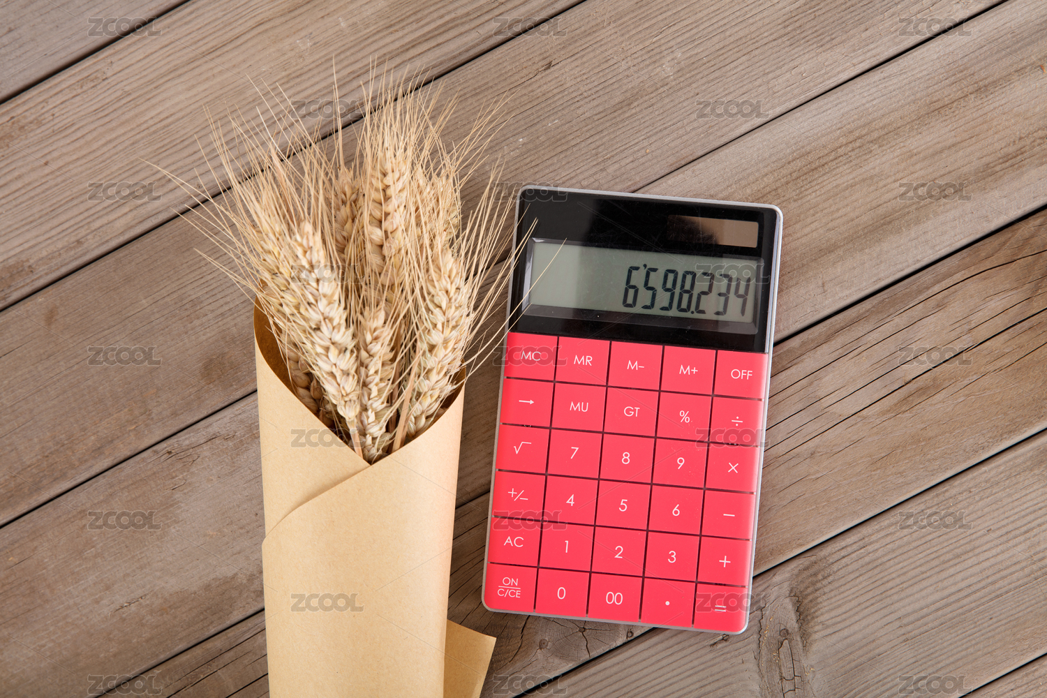 一把牛皮纸包着的小麦麦穗和一个计算器