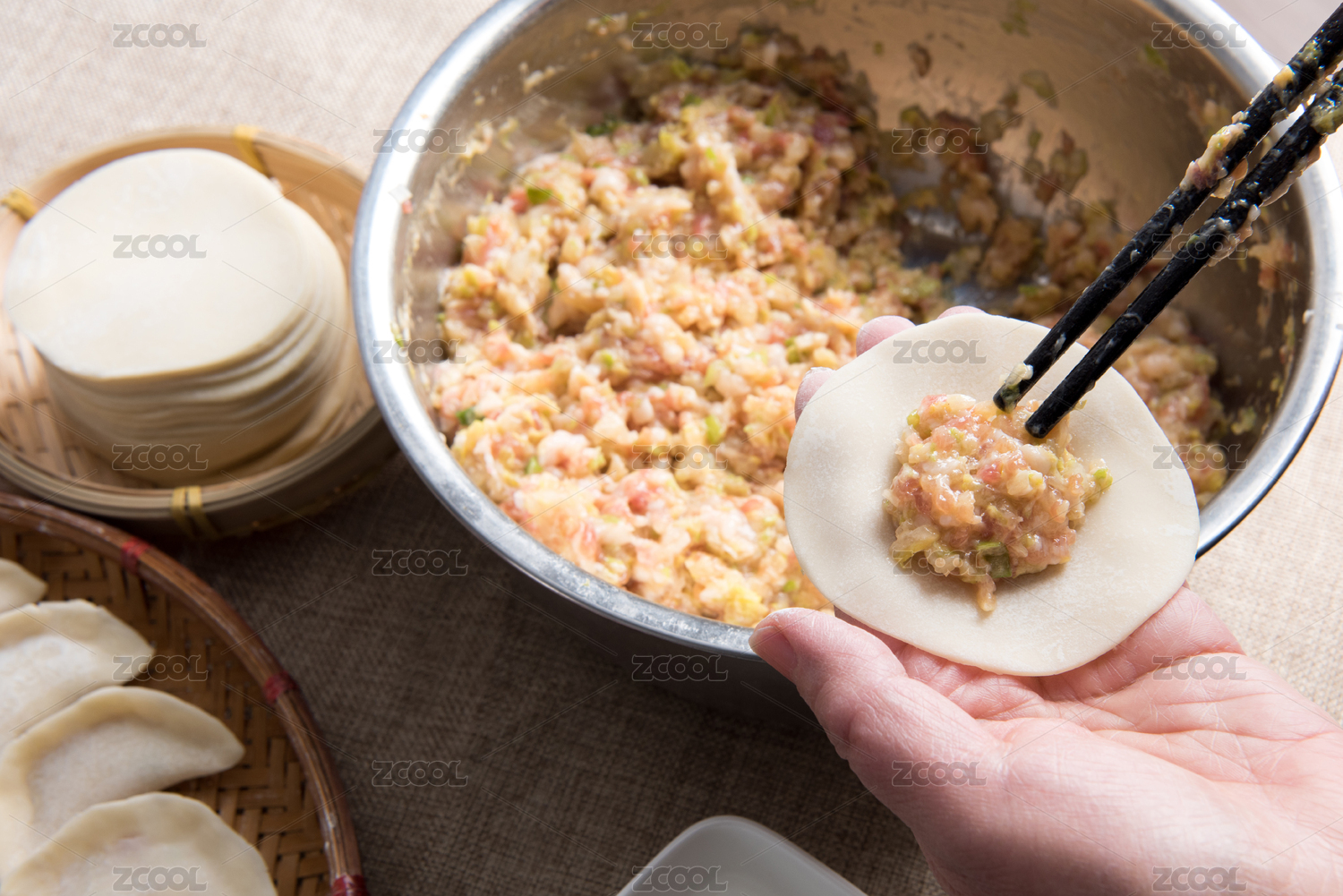 俯视拍摄筷子夹着肉馅放饺子皮上包饺子