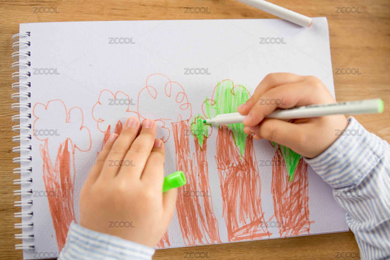 俯视拍摄孩子的小手拿着画笔在纸上画画