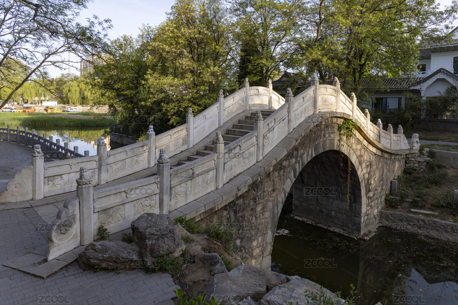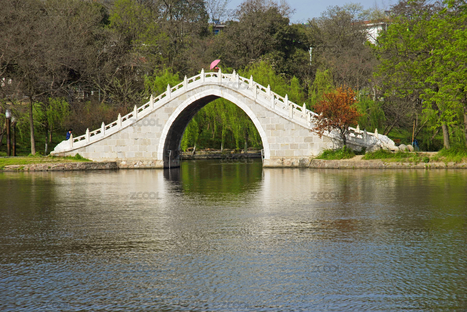 秋天青海省西宁市人民公园湖面上的拱形小桥