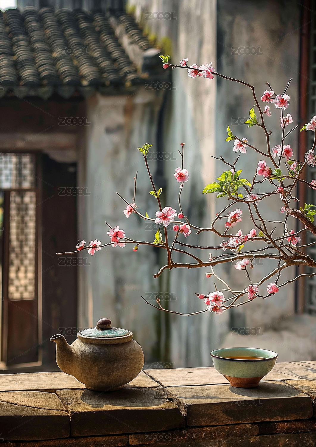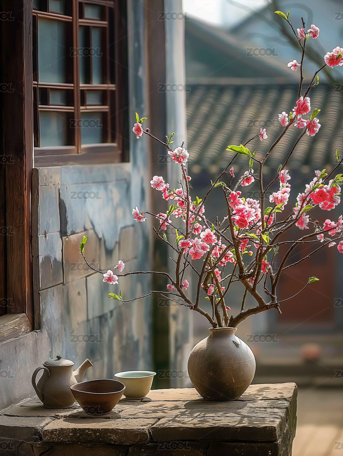 古风花瓶与粉色花枝