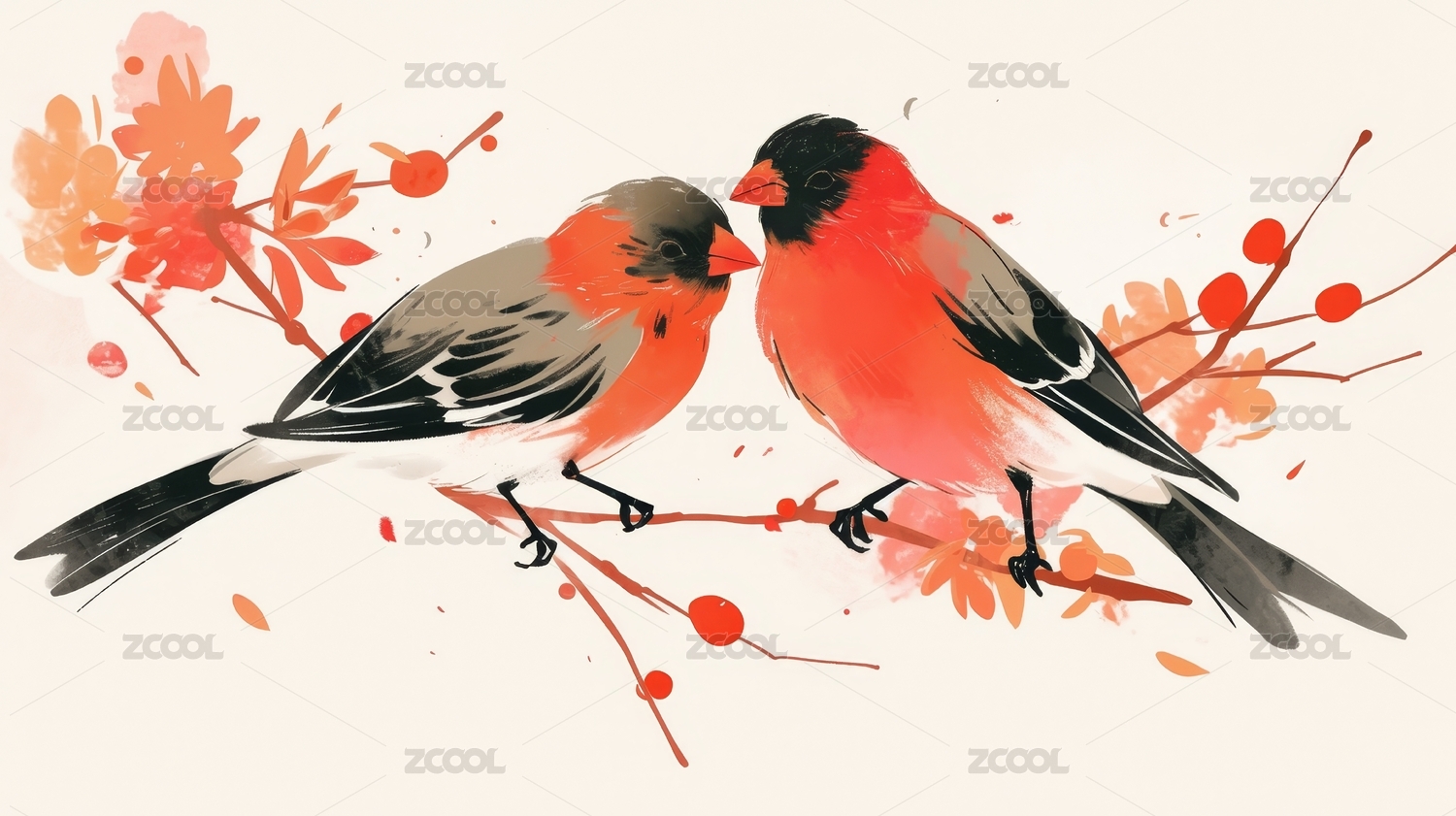 红色小鸟在开满白色花朵的树枝上亲昵依偎