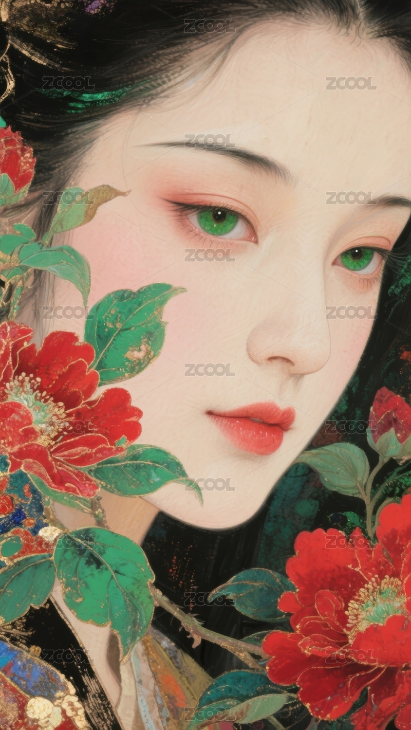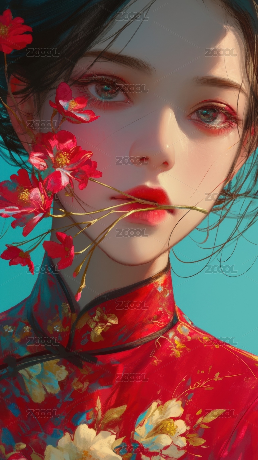 女子与红花的古典肖像