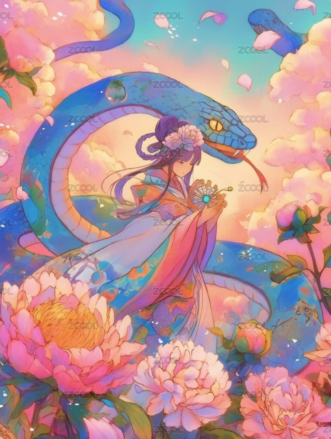 蛇年生肖蛇女孩卡通插画