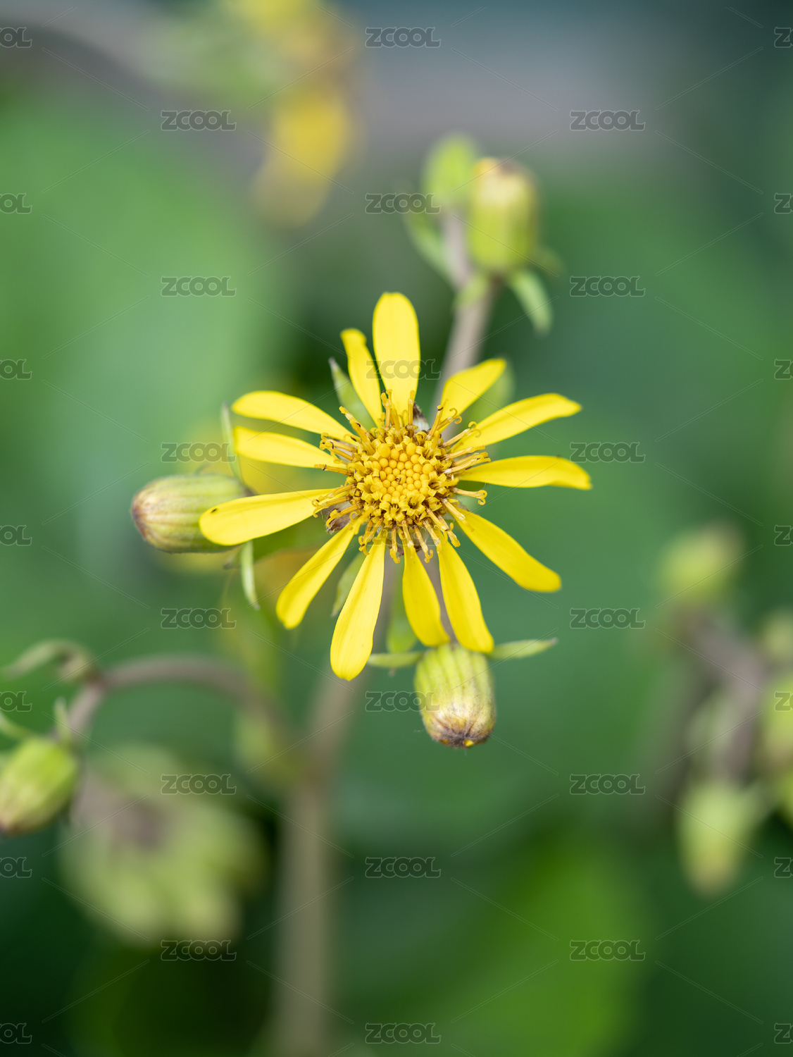 户外春天绿色虚化背景的野菊花微距特写镜头,旋覆花
