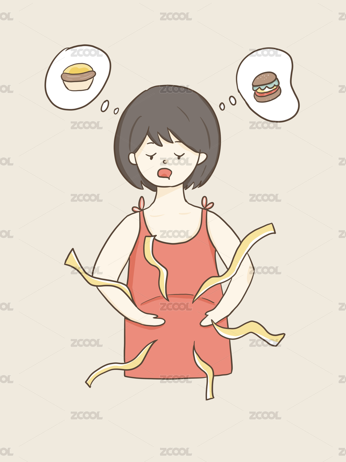 肚子饥饿咕噜叫想吃汉堡包的女孩插画