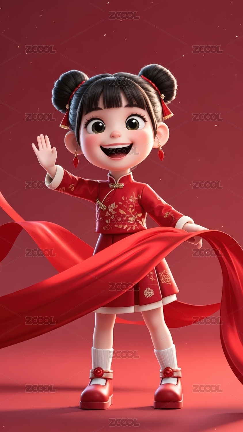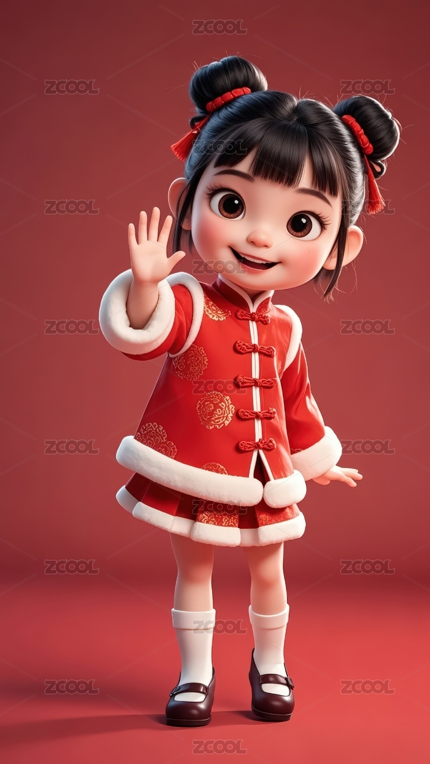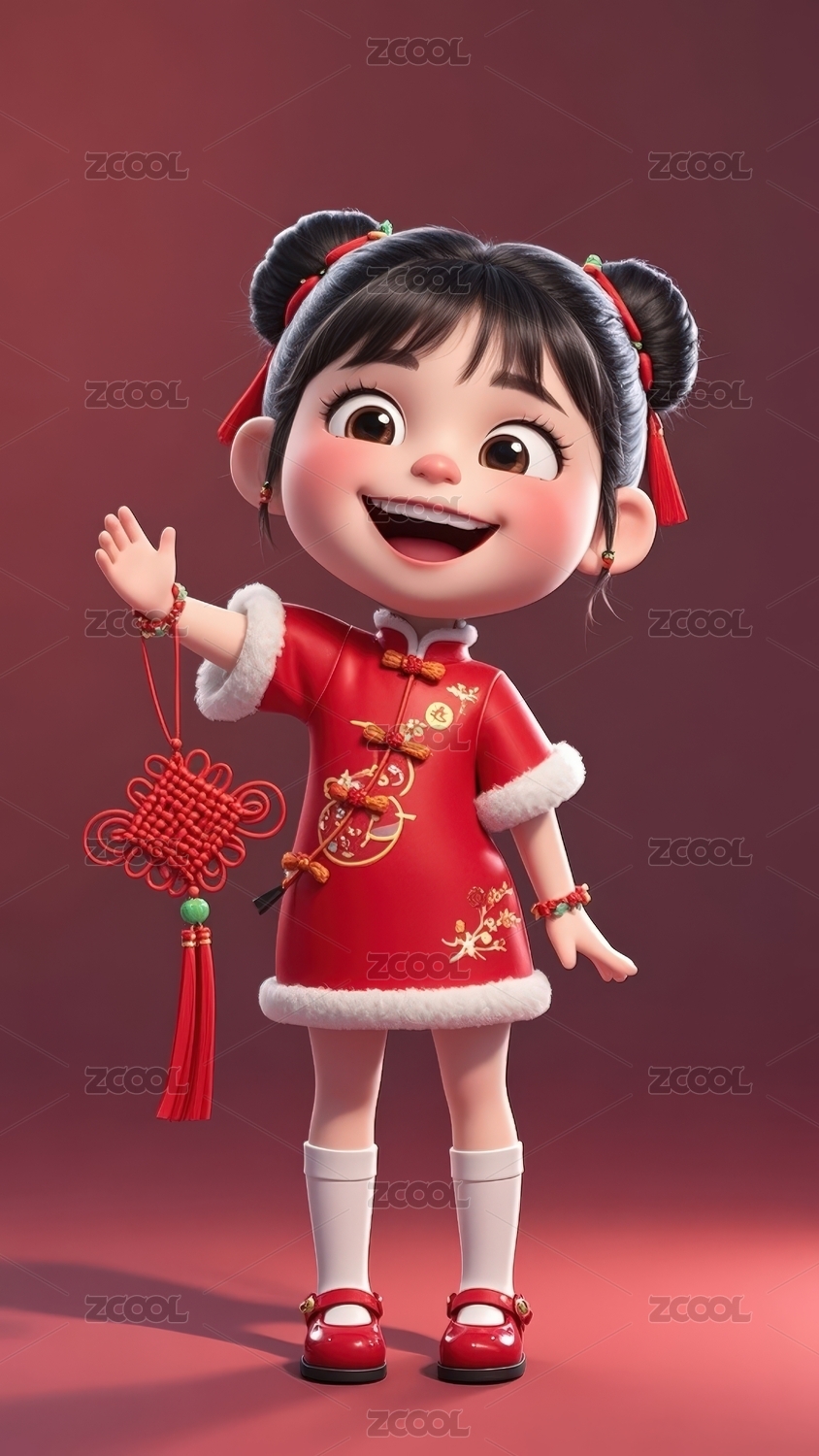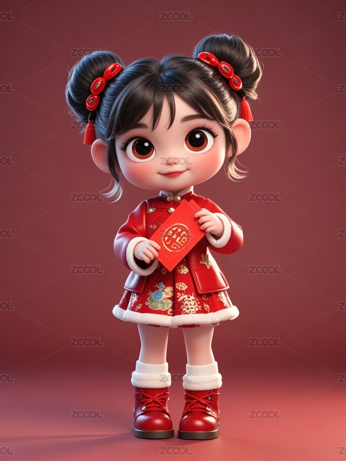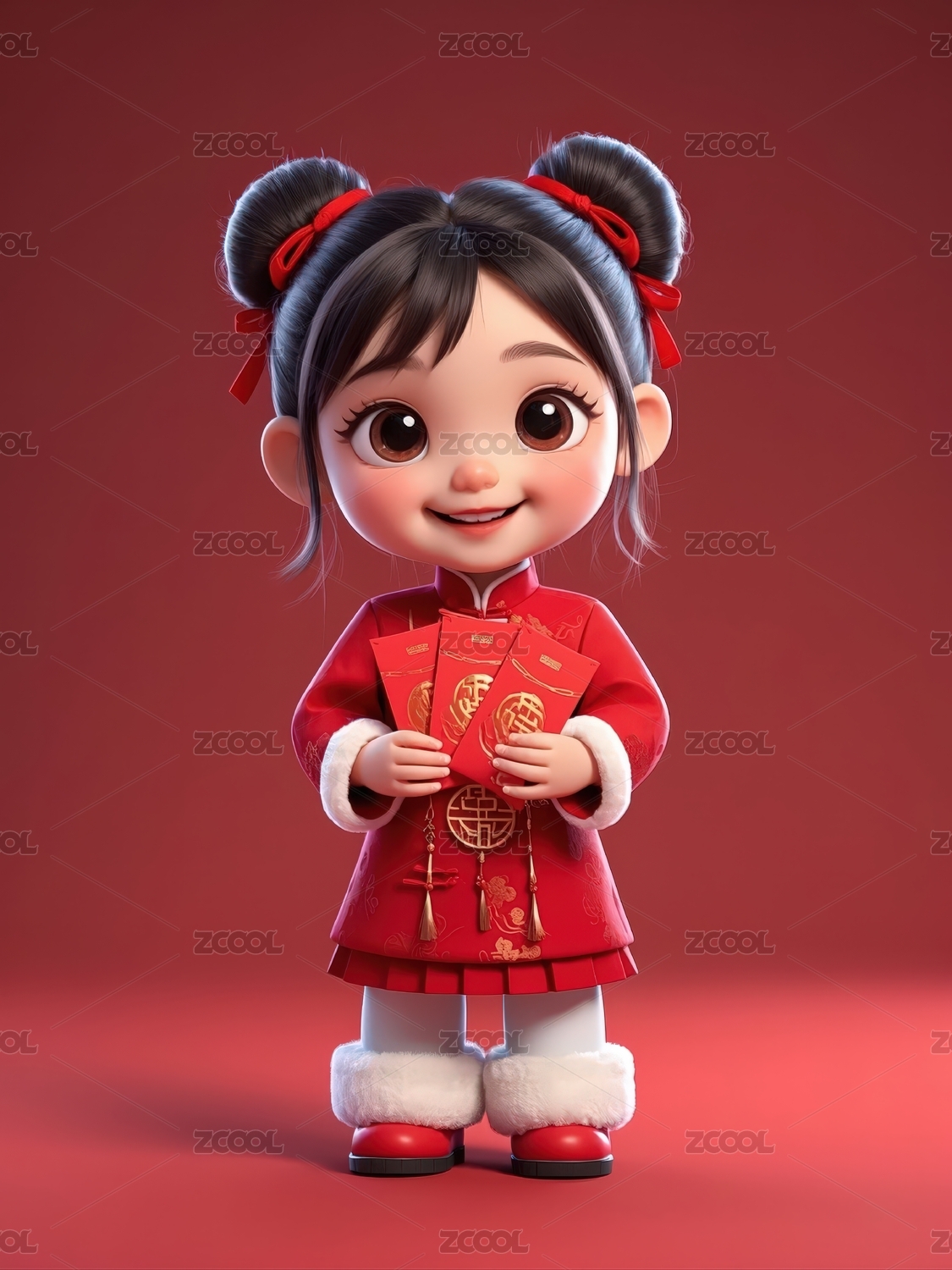 动画, 红色, 喜庆, 节日, 新年, 快乐, 可爱, 3D,卡通, 插图