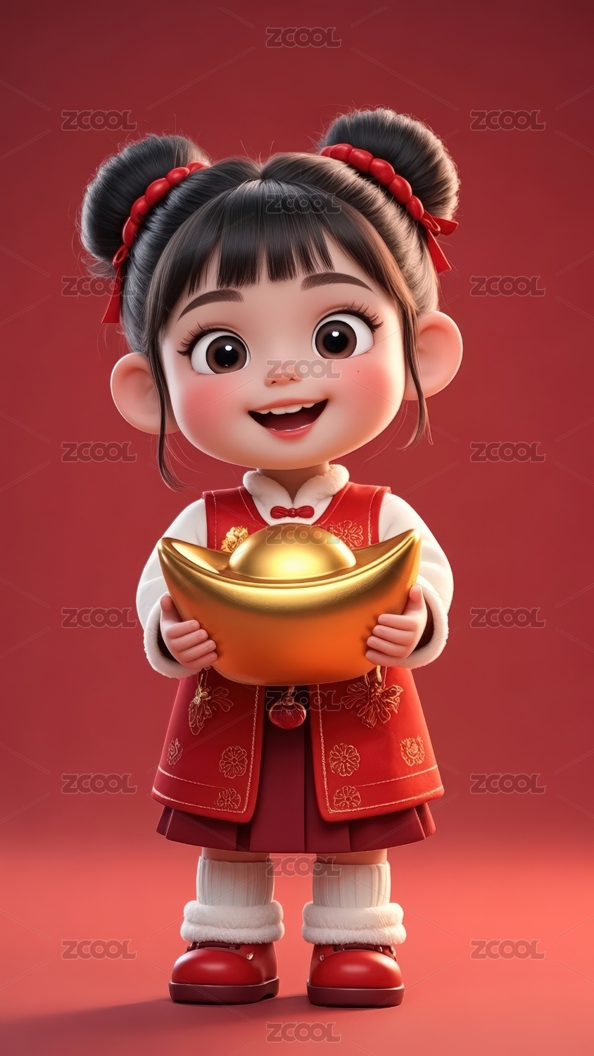 卡通女孩抱着金元宝,喜气洋洋迎新年