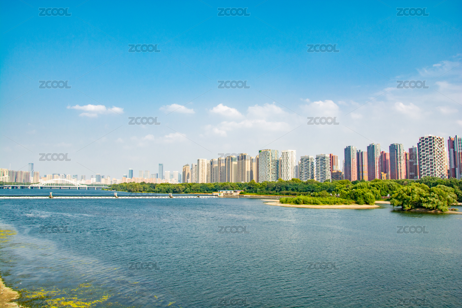秋季中国抚顺蓝天下的城市河岸建筑和大桥