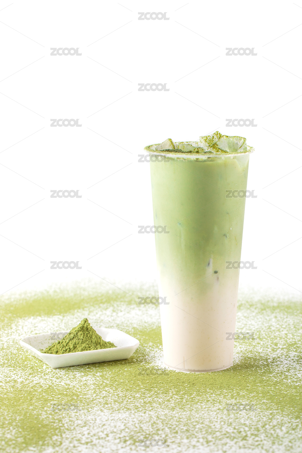 白色背景上的抹茶粉与抹茶饮品