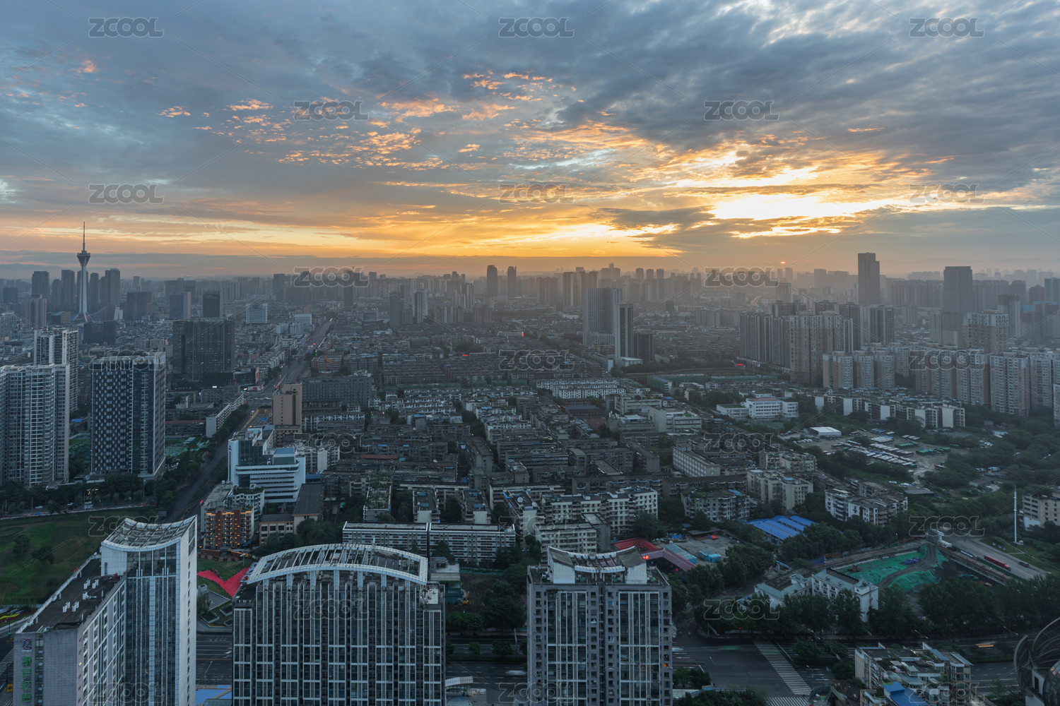 成都老城区的晚霞与城市天际线