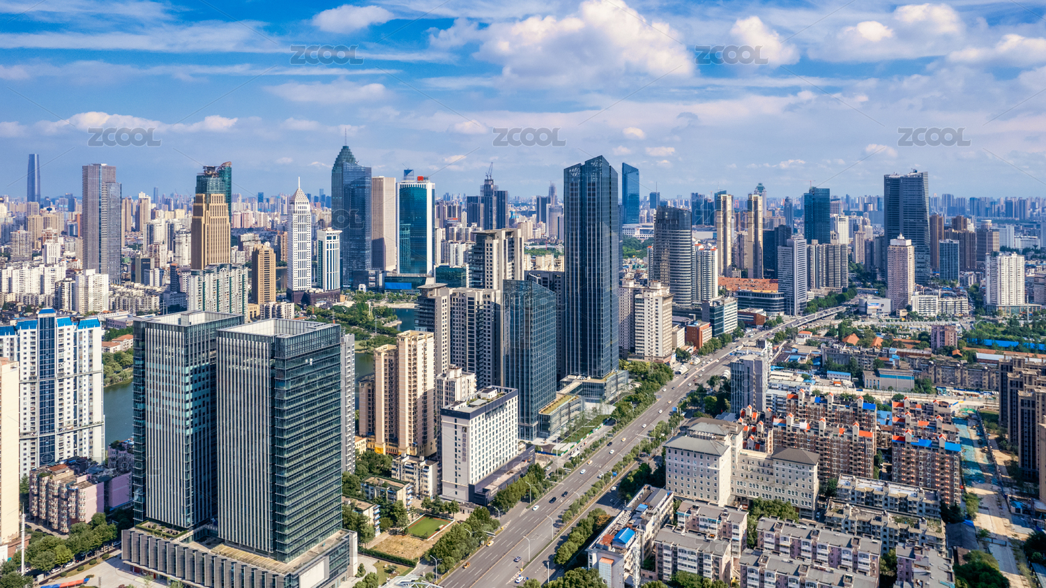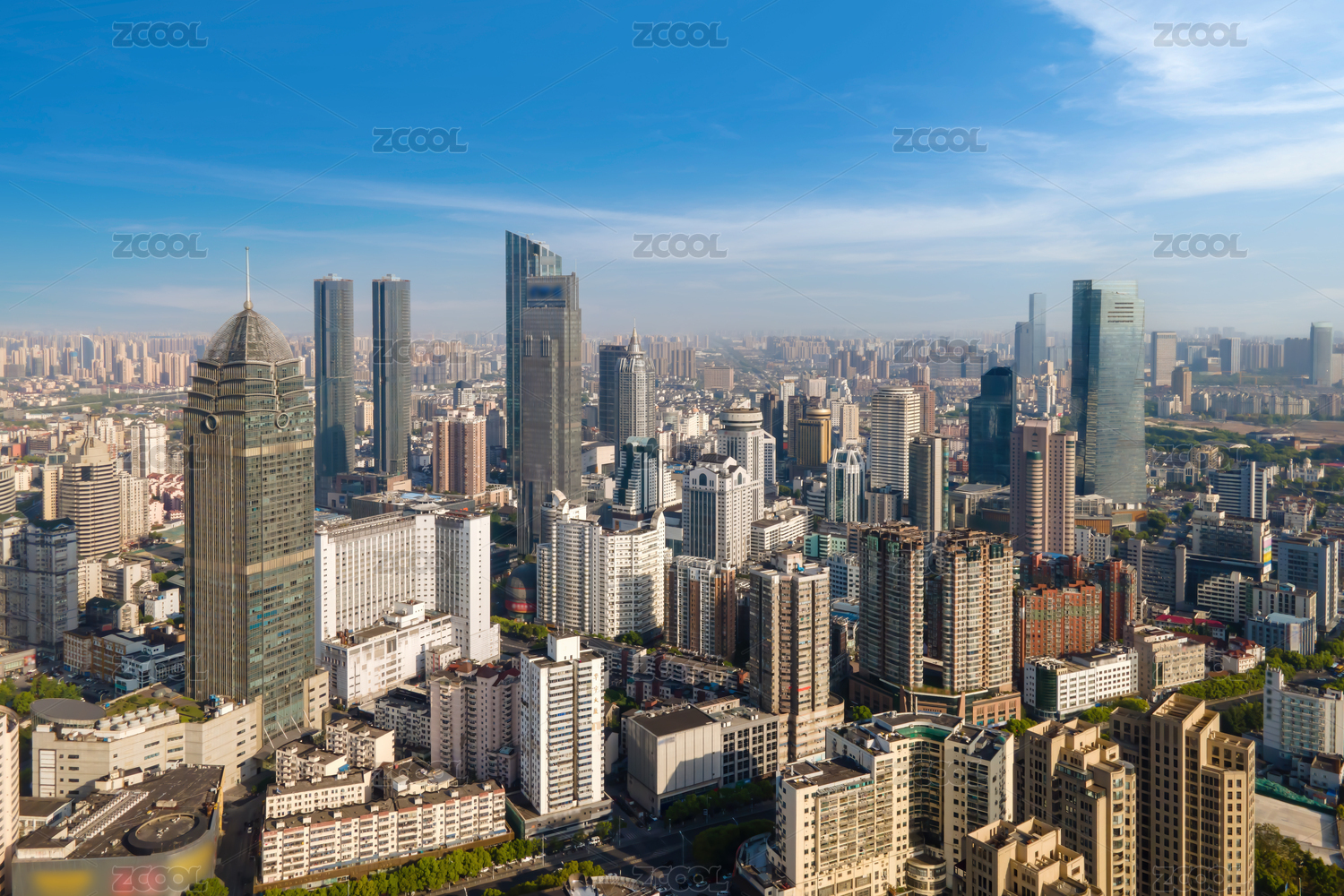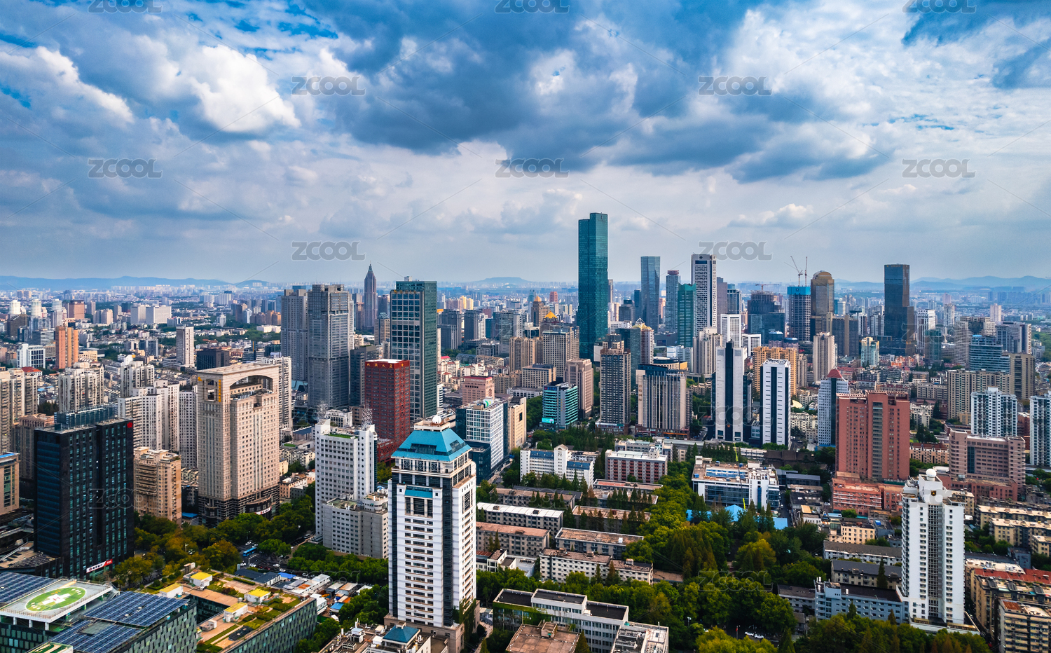 晴朗的蓝天下南京城市中心的城市天际线全景
