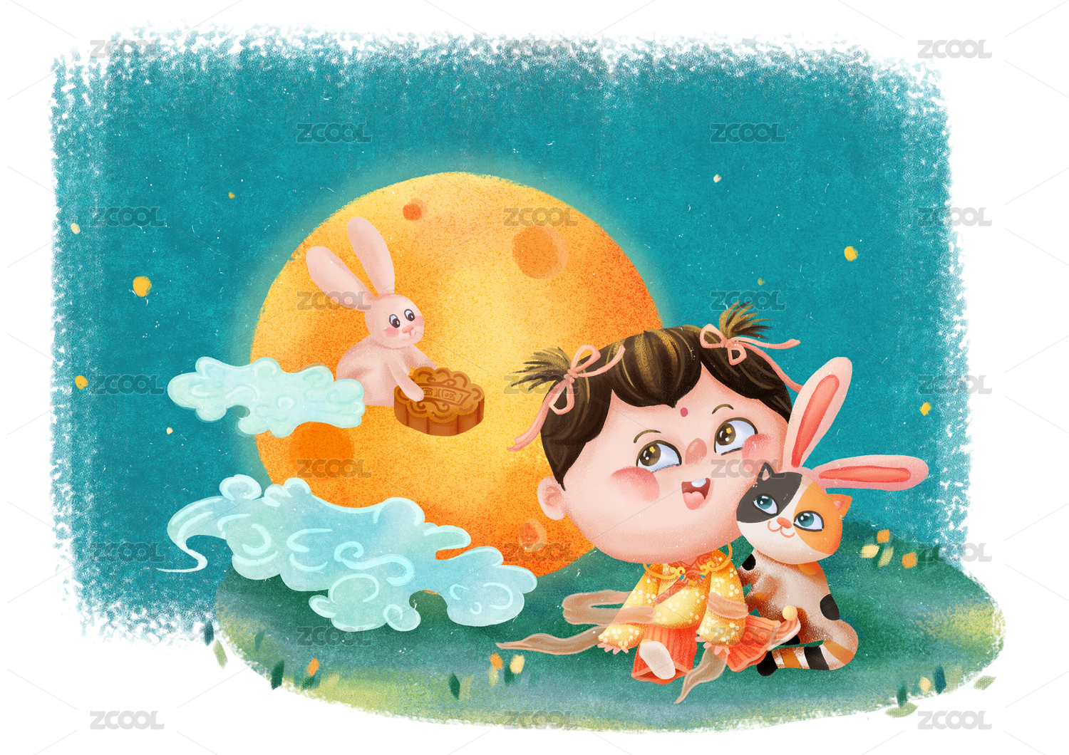兔子抱着月饼住着的月亮下的小朋友和她的小