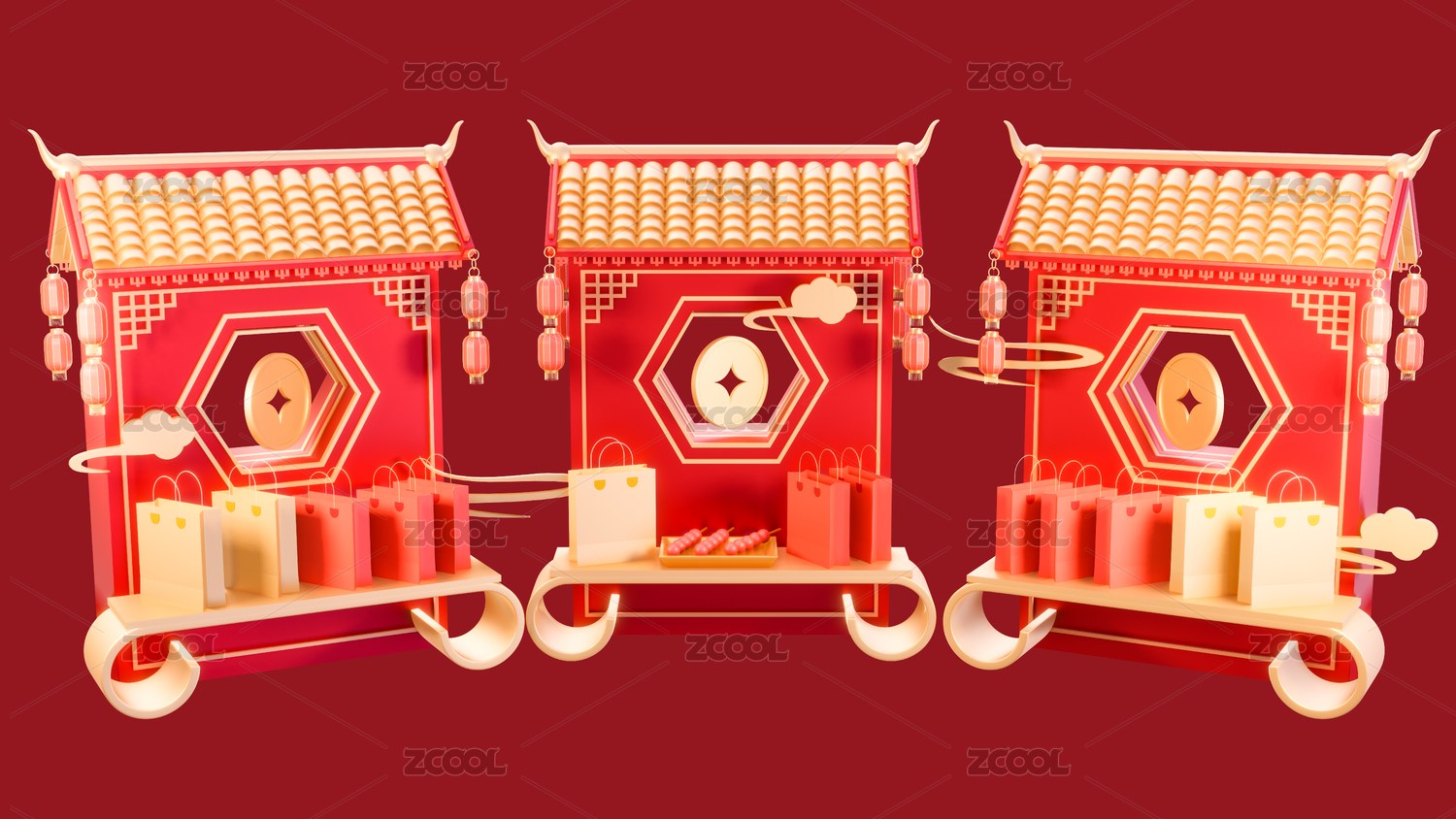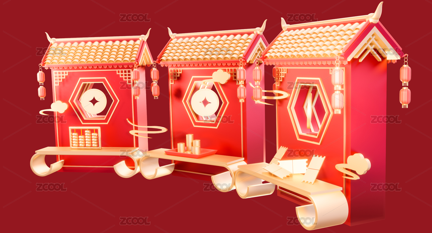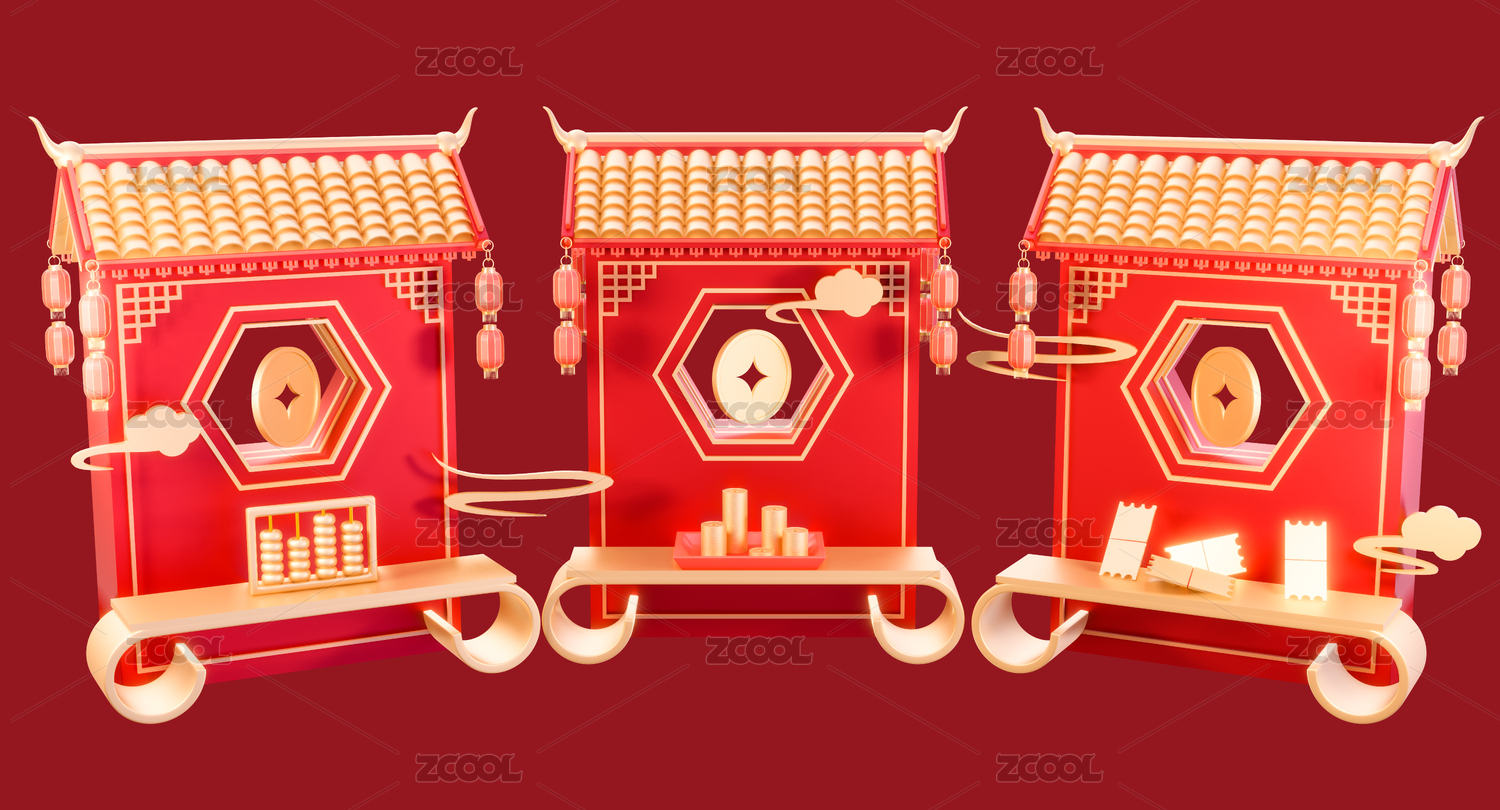 3d中式年货节春节集市摊喜庆场景元素插画
