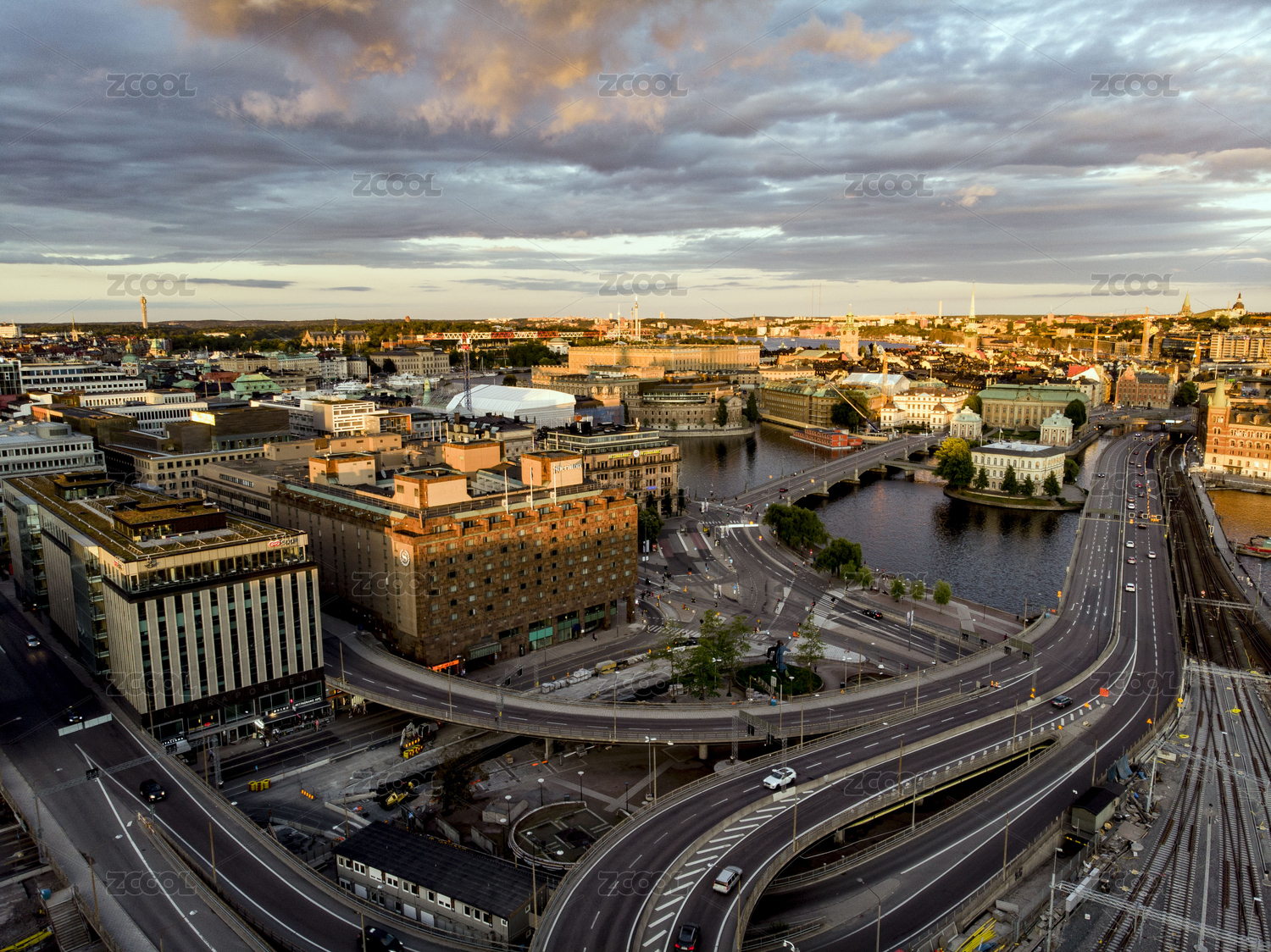 瑞典斯德哥尔摩立交桥及老城傍晚城市风光航拍