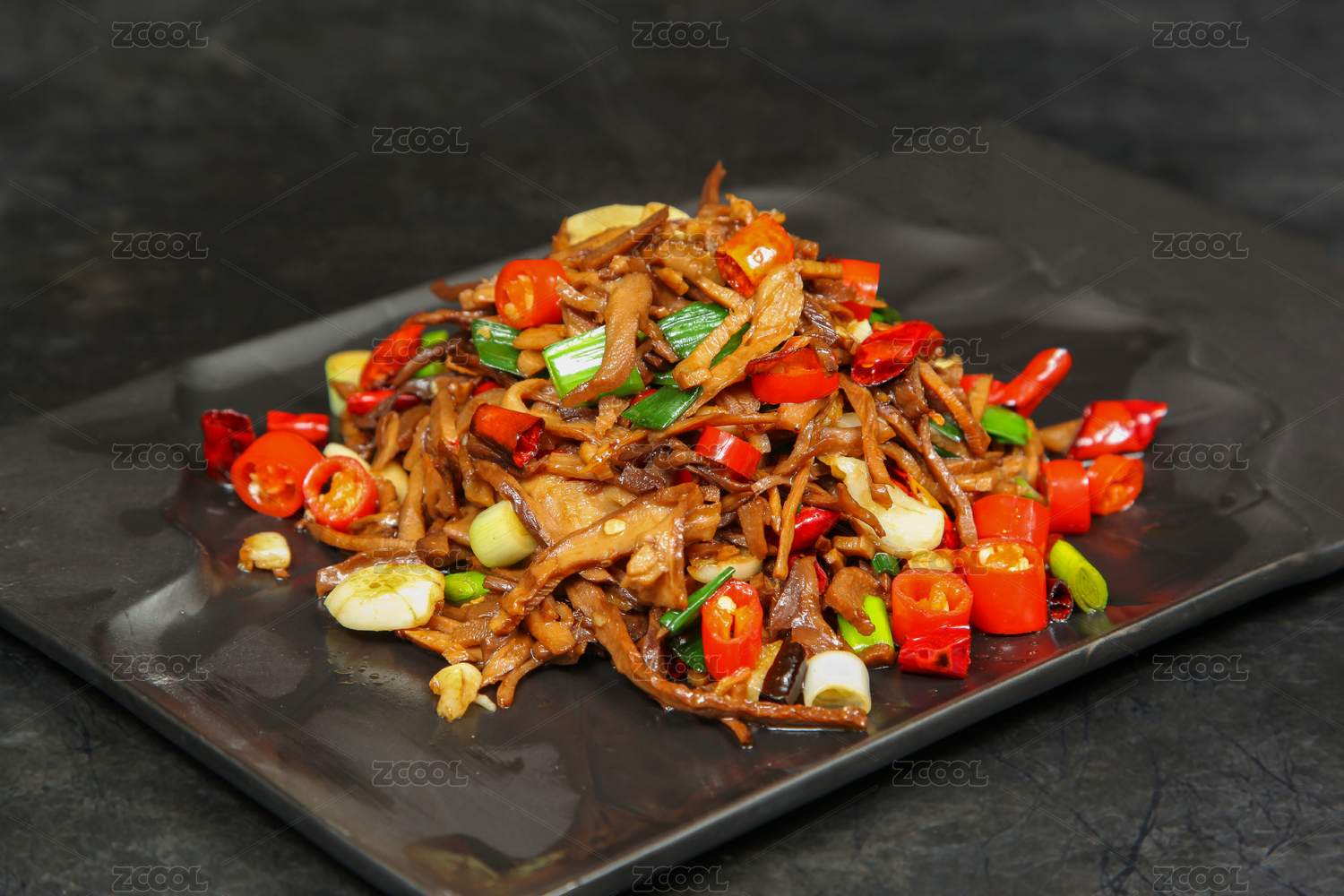 黑色背景湖南特色烟笋炒腊肉
