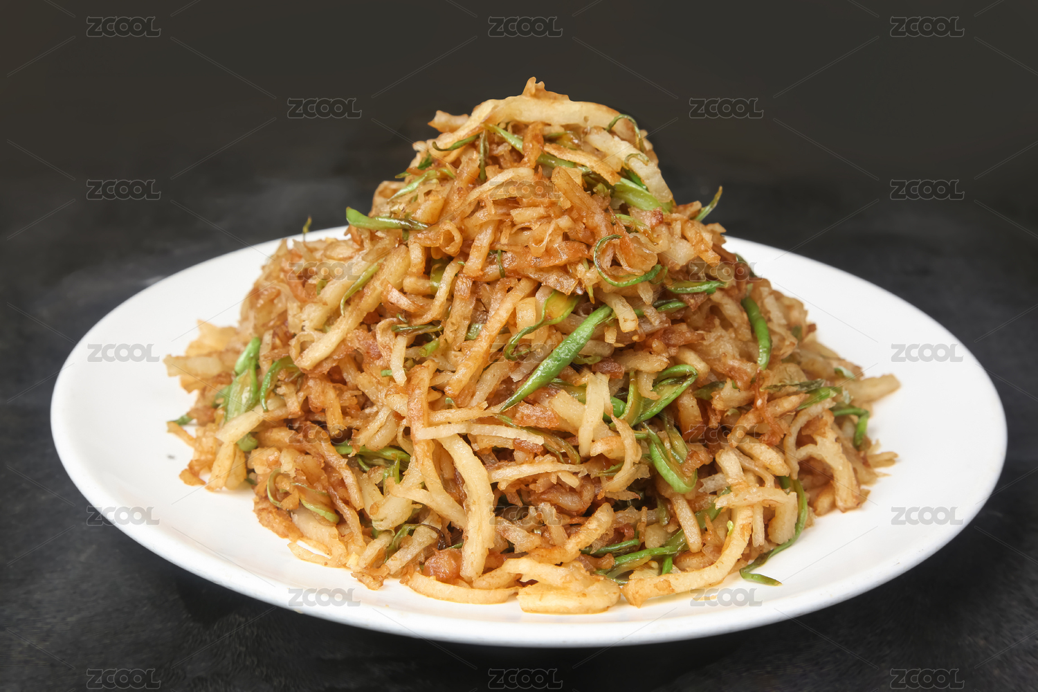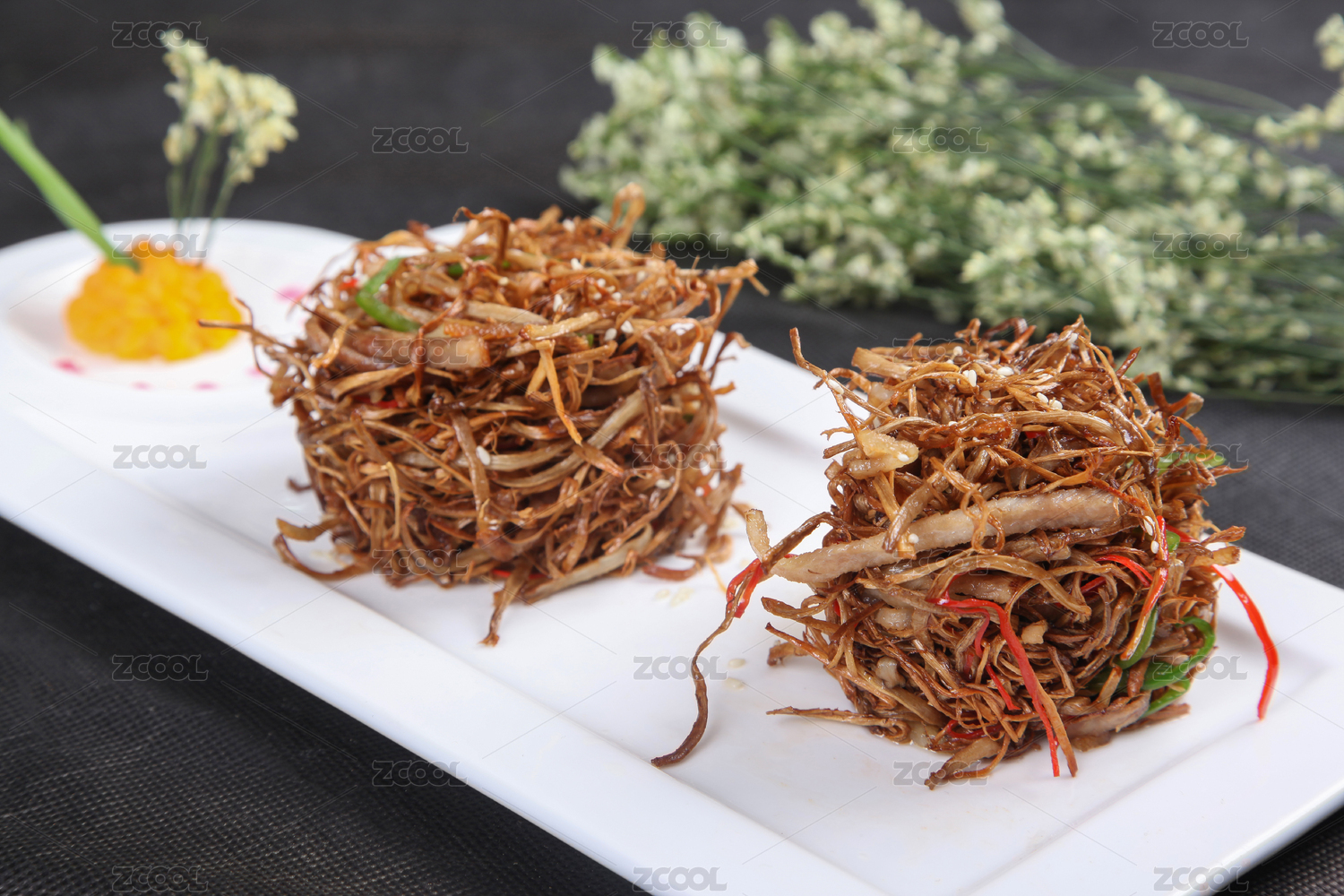 红色瓷盘装的油炸素三丝摆放在樟木砧板上