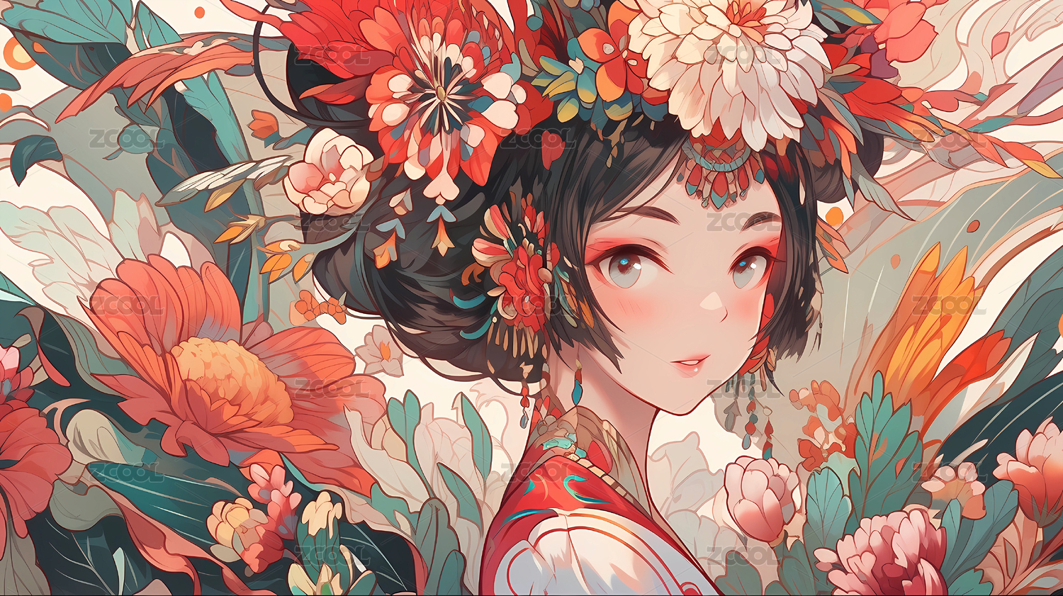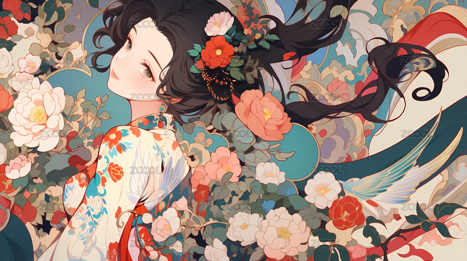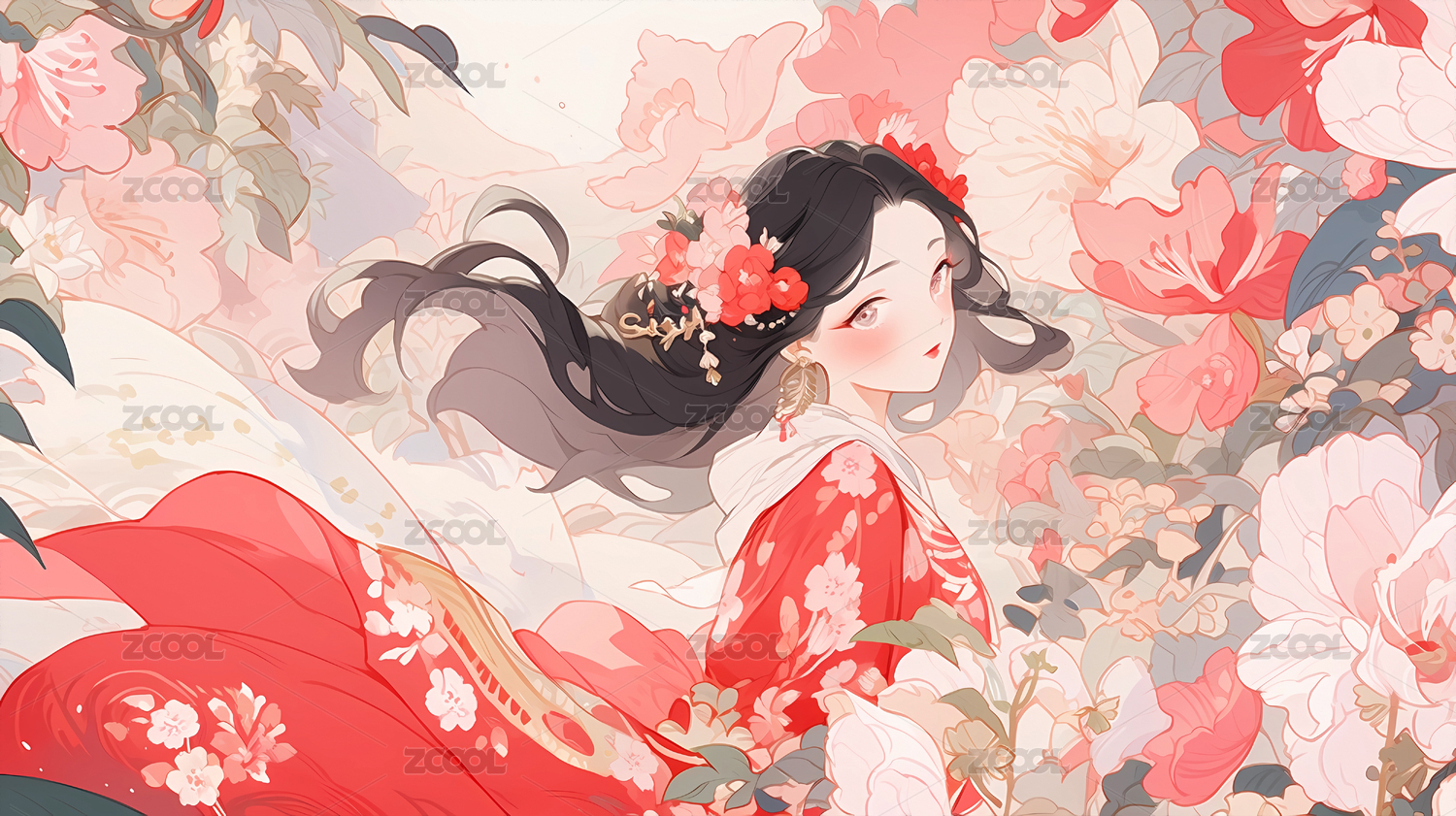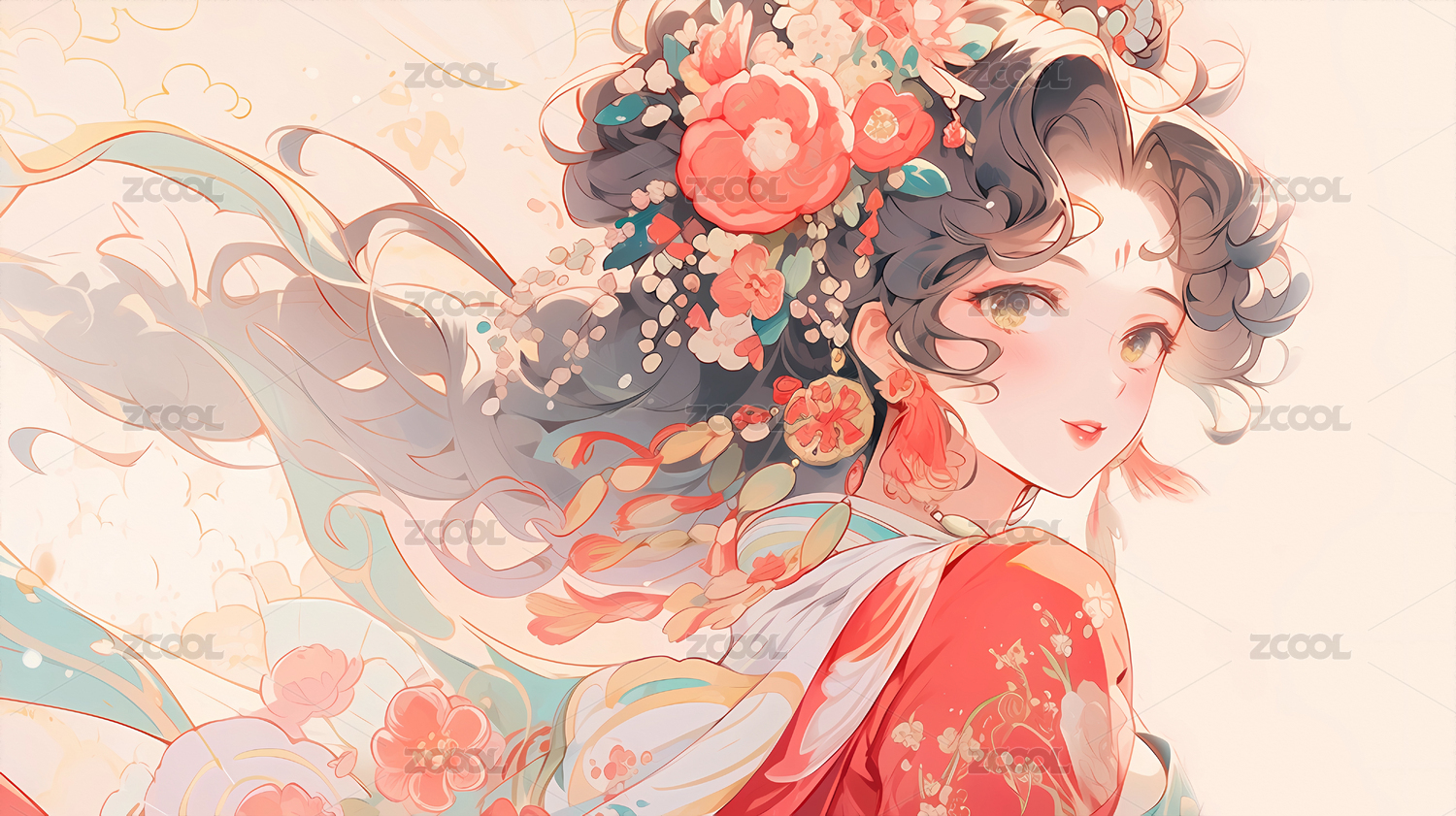 手绘,卡通,动漫,唯美,中国女孩,亚洲文化,女孩,亚洲女孩,盛装,吉祥