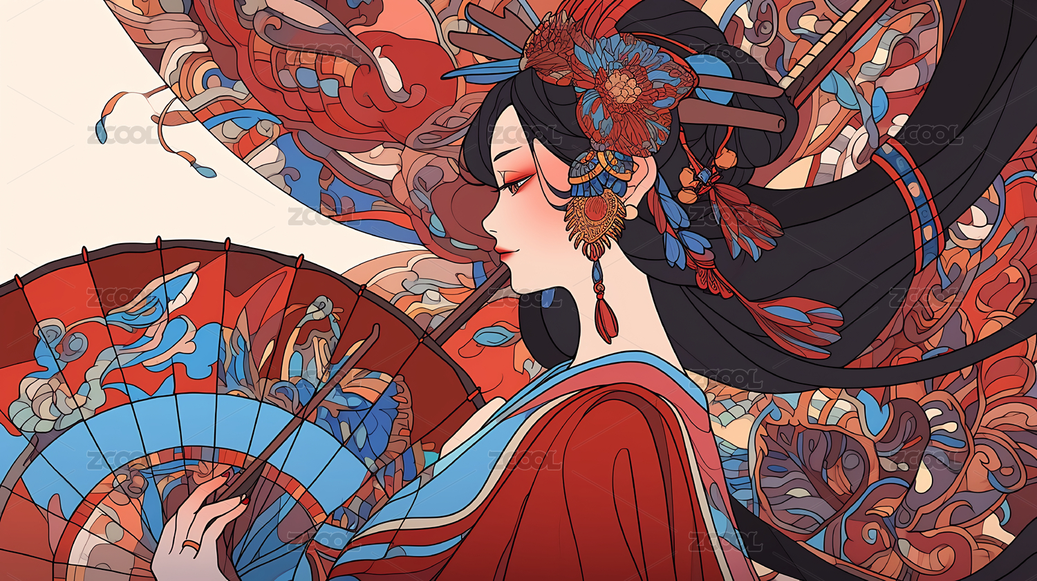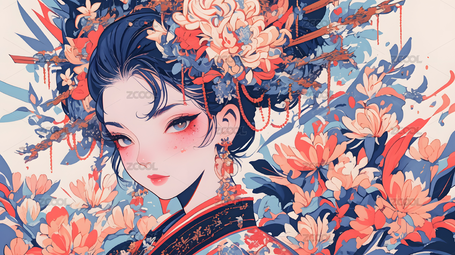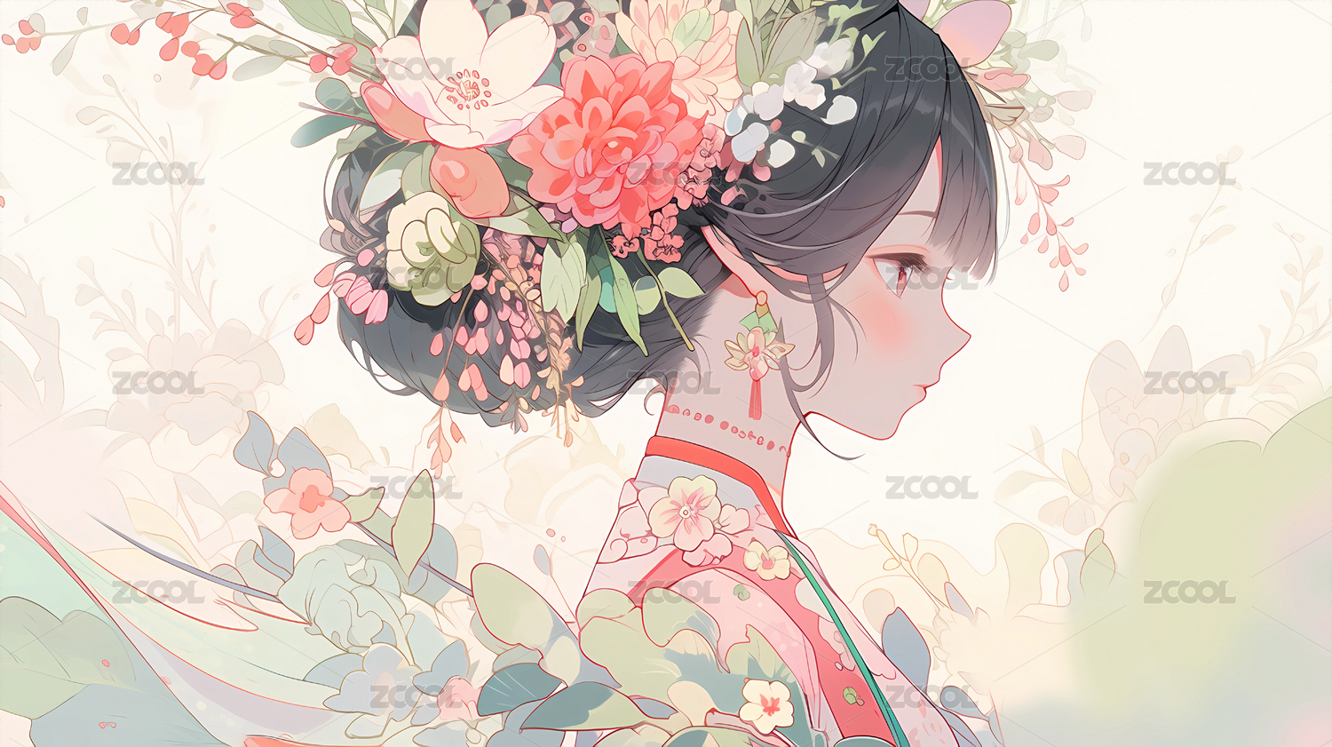 手绘,卡通,动漫,唯美,中国女孩,亚洲文化,女孩,亚洲女孩,盛装,吉祥