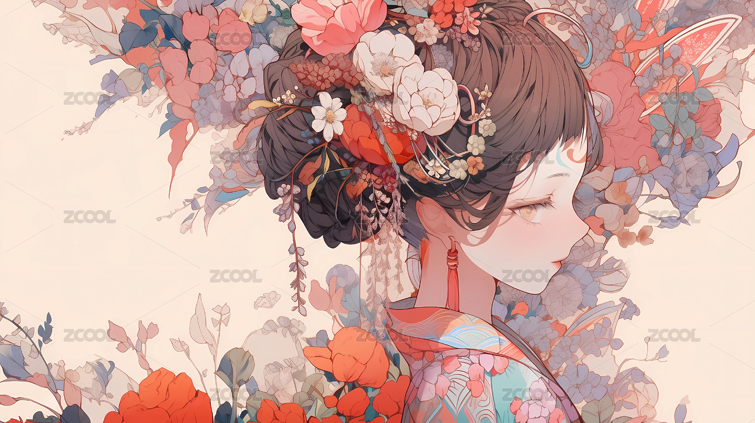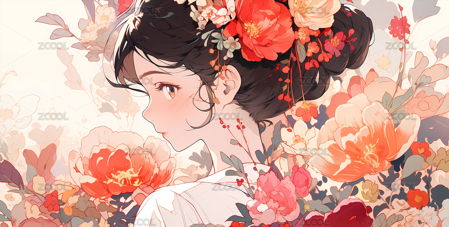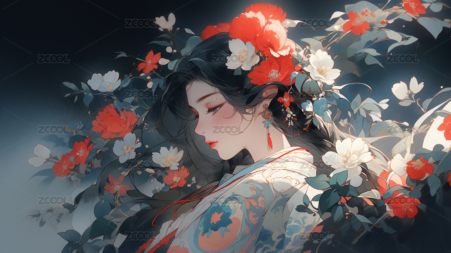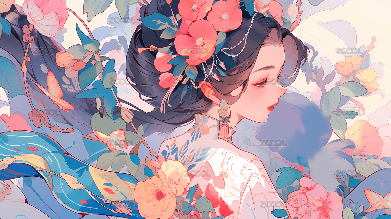 手绘,卡通,动漫,唯美,中国女孩,亚洲文化,女孩,亚洲女孩,盛装,吉祥