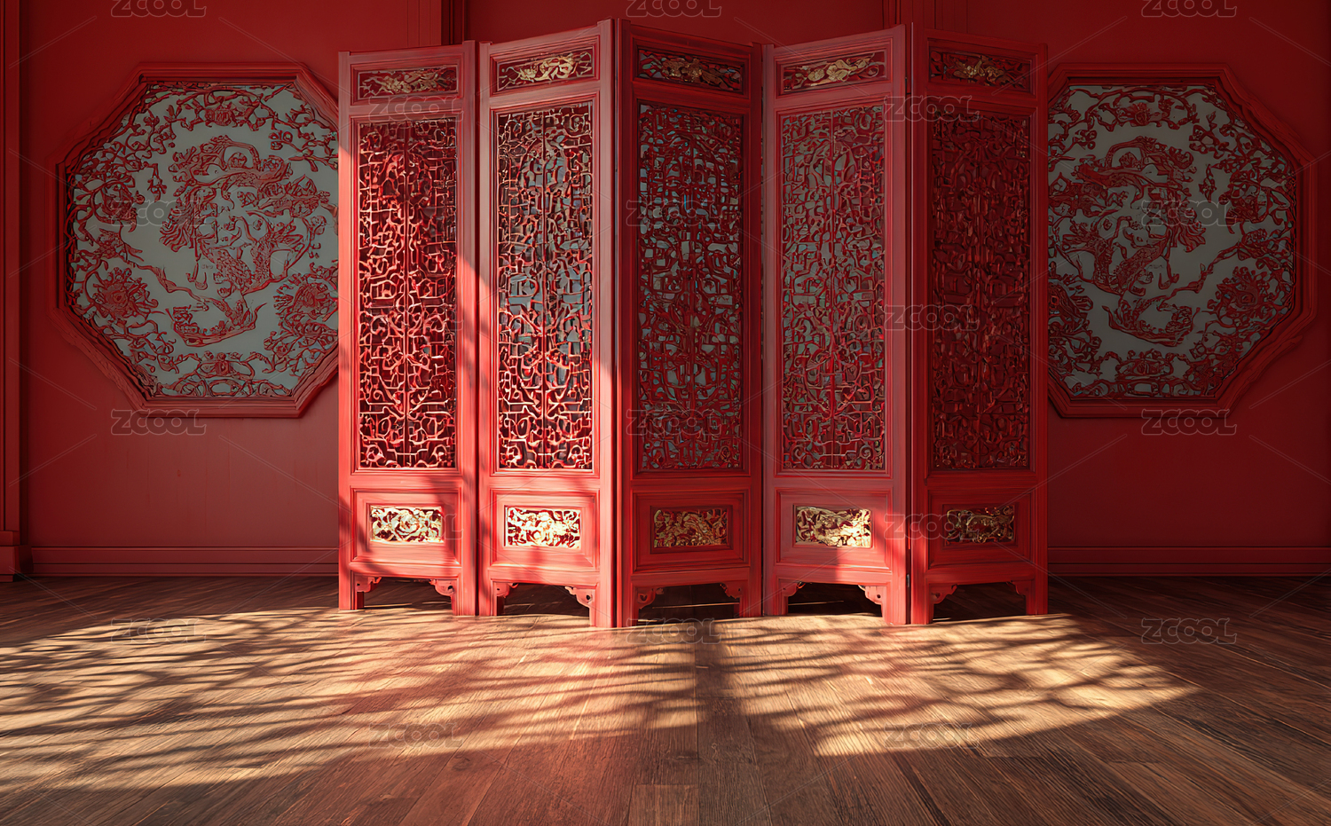 窗户投影旁边的红色中国风木质屏风隔断大门