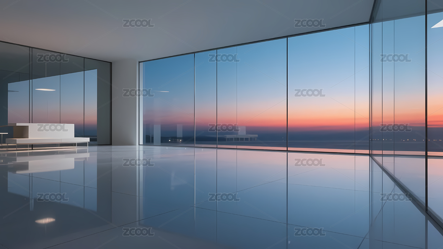 室内落地窗前的日落景