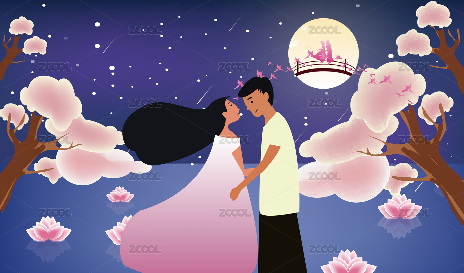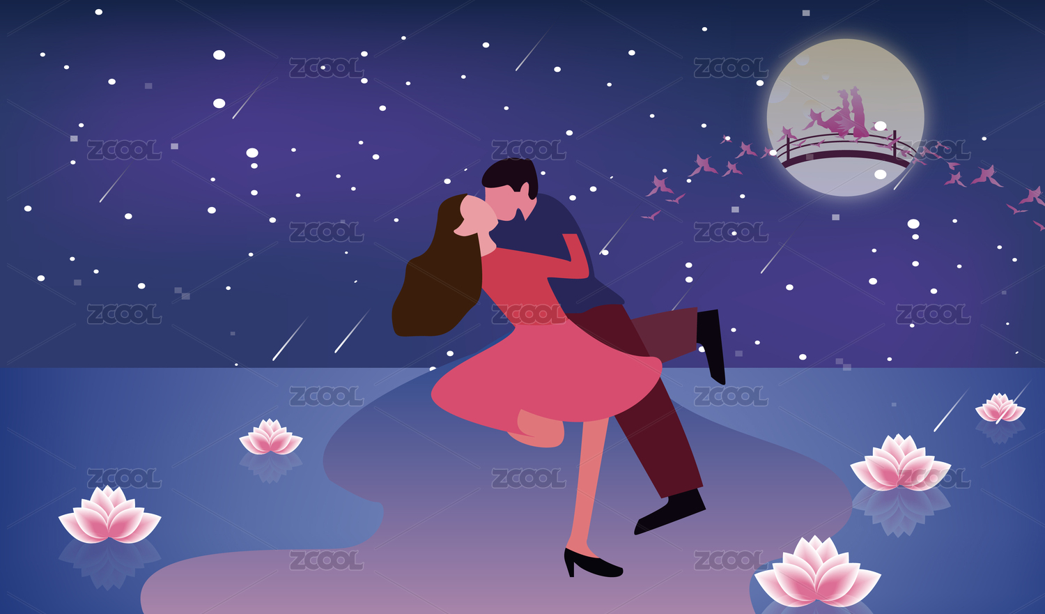 七夕节,情人节,爱情,恋爱,相会,鹊桥,乞巧节,月亮,矢量,手绘