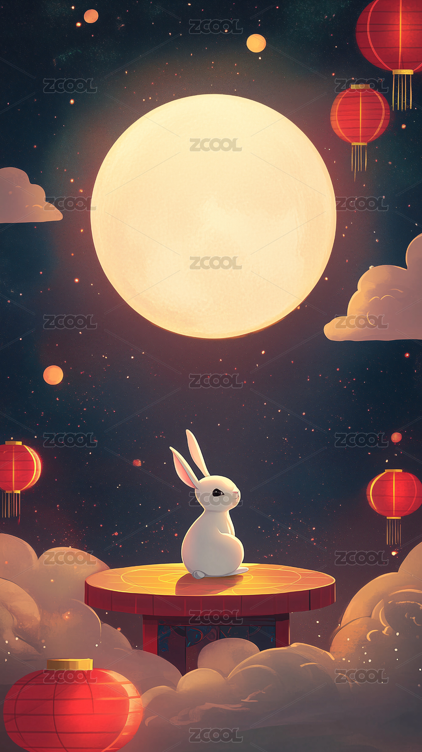中秋节,玉兔,奔月,孔明灯,矢量,扁平,插画,手绘,月球,团圆